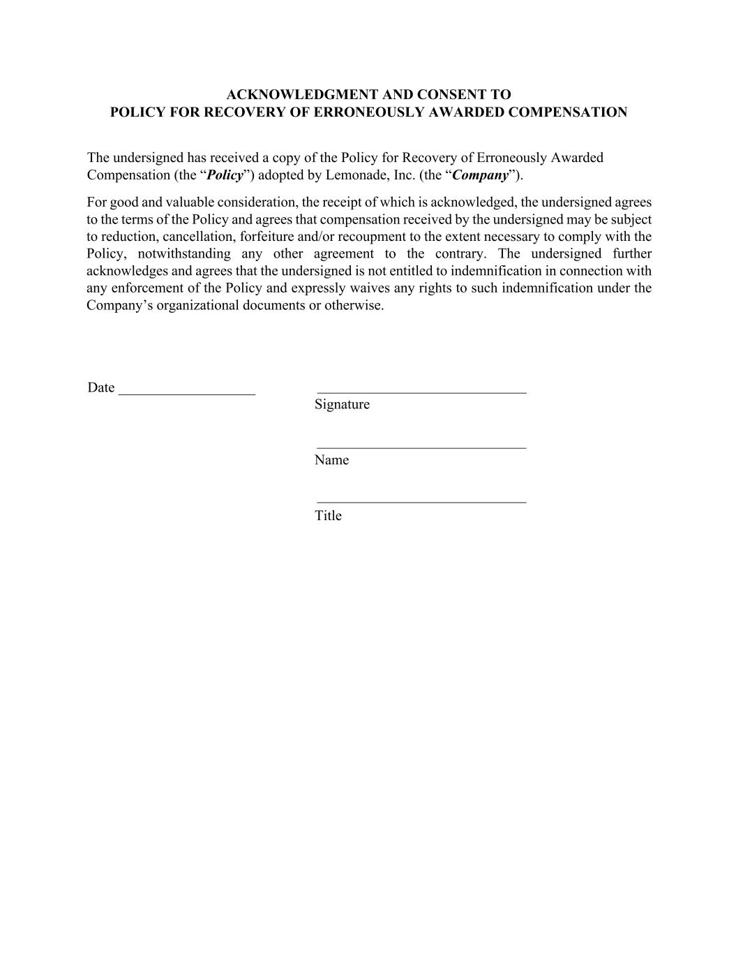 ACKNOWLEDGMENT AND CONSENT TO POLICY FOR RECOVERY OF ERRONEOUSLY AWARDED COMPENSATION The undersigned has received a copy of the Policy for Recovery of Erroneously Awarded Compensation (the “Policy”) adopted by Lemonade, Inc. (the “Company”). For good and valuable consideration, the receipt of which is acknowledged, the undersigned agrees to the terms of the Policy and agrees that compensation received by the undersigned may be subject to reduction, cancellation, forfeiture and/or recoupment to the extent necessary to comply with the Policy, notwithstanding any other agreement to the contrary. The undersigned further acknowledges and agrees that the undersigned is not entitled to indemnification in connection with any enforcement of the Policy and expressly waives any rights to such indemnification under the Company’s organizational documents or otherwise. Date ___________________ Signature Name Title _____________________________ _____________________________ _____________________________