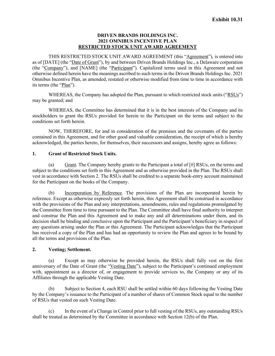Exhibit 10.31 DRIVEN BRANDS HOLDINGS INC. 2021 OMNIBUS INCENTIVE PLAN RESTRICTED STOCK UNIT AWARD AGREEMENT THIS RESTRICTED STOCK UNIT AWARD AGREEMENT (this “Agreement”), is entered into as of [DATE] (the “Date of Grant”), by and between Driven Brands Holdings Inc., a Delaware corporation (the “Company”), and [NAME] (the “Participant”). Capitalized terms used in this Agreement and not otherwise defined herein have the meanings ascribed to such terms in the Driven Brands Holdings Inc. 2021 Omnibus Incentive Plan, as amended, restated or otherwise modified from time to time in accordance with its terms (the “Plan”). WHEREAS, the Company has adopted the Plan, pursuant to which restricted stock units (“RSUs”) may be granted; and WHEREAS, the Committee has determined that it is in the best interests of the Company and its stockholders to grant the RSUs provided for herein to the Participant on the terms and subject to the conditions set forth herein. NOW, THEREFORE, for and in consideration of the premises and the covenants of the parties contained in this Agreement, and for other good and valuable consideration, the receipt of which is hereby acknowledged, the parties hereto, for themselves, their successors and assigns, hereby agree as follows: 1. Grant of Restricted Stock Units. (a) Grant. The Company hereby grants to the Participant a total of [#] RSUs, on the terms and subject to the conditions set forth in this Agreement and as otherwise provided in the Plan. The RSUs shall vest in accordance with Section 2. The RSUs shall be credited to a separate book-entry account maintained for the Participant on the books of the Company. (b) Incorporation by Reference. The provisions of the Plan are incorporated herein by reference. Except as otherwise expressly set forth herein, this Agreement shall be construed in accordance with the provisions of the Plan and any interpretations, amendments, rules and regulations promulgated by the Committee from time to time pursuant to the Plan. The Committee shall have final authority to interpret and construe the Plan and this Agreement and to make any and all determinations under them, and its decision shall be binding and conclusive upon the Participant and the Participant’s beneficiary in respect of any questions arising under the Plan or this Agreement. The Participant acknowledges that the Participant has received a copy of the Plan and has had an opportunity to review the Plan and agrees to be bound by all the terms and provisions of the Plan. 2. Vesting; Settlement. (a) Except as may otherwise be provided herein, the RSUs shall fully vest on the first anniversary of the Date of Grant (the “Vesting Date”), subject to the Participant’s continued employment with, appointment as a director of, or engagement to provide services to, the Company or any of its Affiliates through the applicable Vesting Date. (b) Subject to Section 4, each RSU shall be settled within 60 days following the Vesting Date by the Company’s issuance to the Participant of a number of shares of Common Stock equal to the number of RSUs that vested on such Vesting Date. (c) In the event of a Change in Control prior to full vesting of the RSUs, any outstanding RSUs shall be treated as determined by the Committee in accordance with Section 12(b) of the Plan.