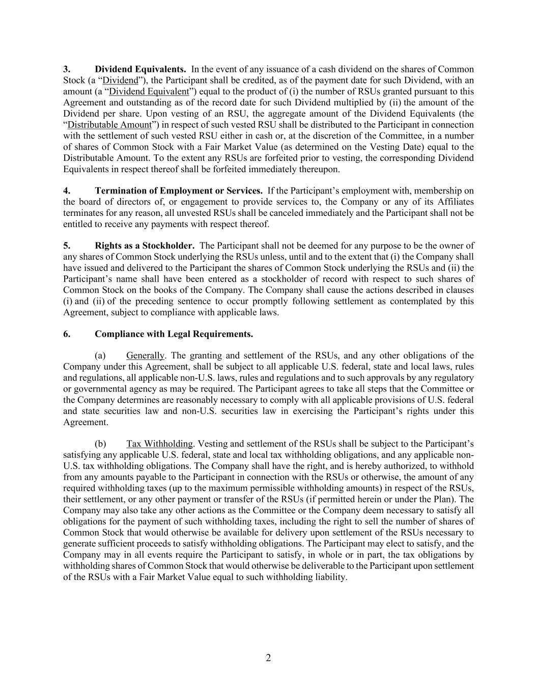 2 3. Dividend Equivalents. In the event of any issuance of a cash dividend on the shares of Common Stock (a “Dividend”), the Participant shall be credited, as of the payment date for such Dividend, with an amount (a “Dividend Equivalent”) equal to the product of (i) the number of RSUs granted pursuant to this Agreement and outstanding as of the record date for such Dividend multiplied by (ii) the amount of the Dividend per share. Upon vesting of an RSU, the aggregate amount of the Dividend Equivalents (the “Distributable Amount”) in respect of such vested RSU shall be distributed to the Participant in connection with the settlement of such vested RSU either in cash or, at the discretion of the Committee, in a number of shares of Common Stock with a Fair Market Value (as determined on the Vesting Date) equal to the Distributable Amount. To the extent any RSUs are forfeited prior to vesting, the corresponding Dividend Equivalents in respect thereof shall be forfeited immediately thereupon. 4. Termination of Employment or Services. If the Participant’s employment with, membership on the board of directors of, or engagement to provide services to, the Company or any of its Affiliates terminates for any reason, all unvested RSUs shall be canceled immediately and the Participant shall not be entitled to receive any payments with respect thereof. 5. Rights as a Stockholder. The Participant shall not be deemed for any purpose to be the owner of any shares of Common Stock underlying the RSUs unless, until and to the extent that (i) the Company shall have issued and delivered to the Participant the shares of Common Stock underlying the RSUs and (ii) the Participant’s name shall have been entered as a stockholder of record with respect to such shares of Common Stock on the books of the Company. The Company shall cause the actions described in clauses (i) and (ii) of the preceding sentence to occur promptly following settlement as contemplated by this Agreement, subject to compliance with applicable laws. 6. Compliance with Legal Requirements. (a) Generally. The granting and settlement of the RSUs, and any other obligations of the Company under this Agreement, shall be subject to all applicable U.S. federal, state and local laws, rules and regulations, all applicable non-U.S. laws, rules and regulations and to such approvals by any regulatory or governmental agency as may be required. The Participant agrees to take all steps that the Committee or the Company determines are reasonably necessary to comply with all applicable provisions of U.S. federal and state securities law and non-U.S. securities law in exercising the Participant’s rights under this Agreement. (b) Tax Withholding. Vesting and settlement of the RSUs shall be subject to the Participant’s satisfying any applicable U.S. federal, state and local tax withholding obligations, and any applicable non- U.S. tax withholding obligations. The Company shall have the right, and is hereby authorized, to withhold from any amounts payable to the Participant in connection with the RSUs or otherwise, the amount of any required withholding taxes (up to the maximum permissible withholding amounts) in respect of the RSUs, their settlement, or any other payment or transfer of the RSUs (if permitted herein or under the Plan). The Company may also take any other actions as the Committee or the Company deem necessary to satisfy all obligations for the payment of such withholding taxes, including the right to sell the number of shares of Common Stock that would otherwise be available for delivery upon settlement of the RSUs necessary to generate sufficient proceeds to satisfy withholding obligations. The Participant may elect to satisfy, and the Company may in all events require the Participant to satisfy, in whole or in part, the tax obligations by withholding shares of Common Stock that would otherwise be deliverable to the Participant upon settlement of the RSUs with a Fair Market Value equal to such withholding liability.