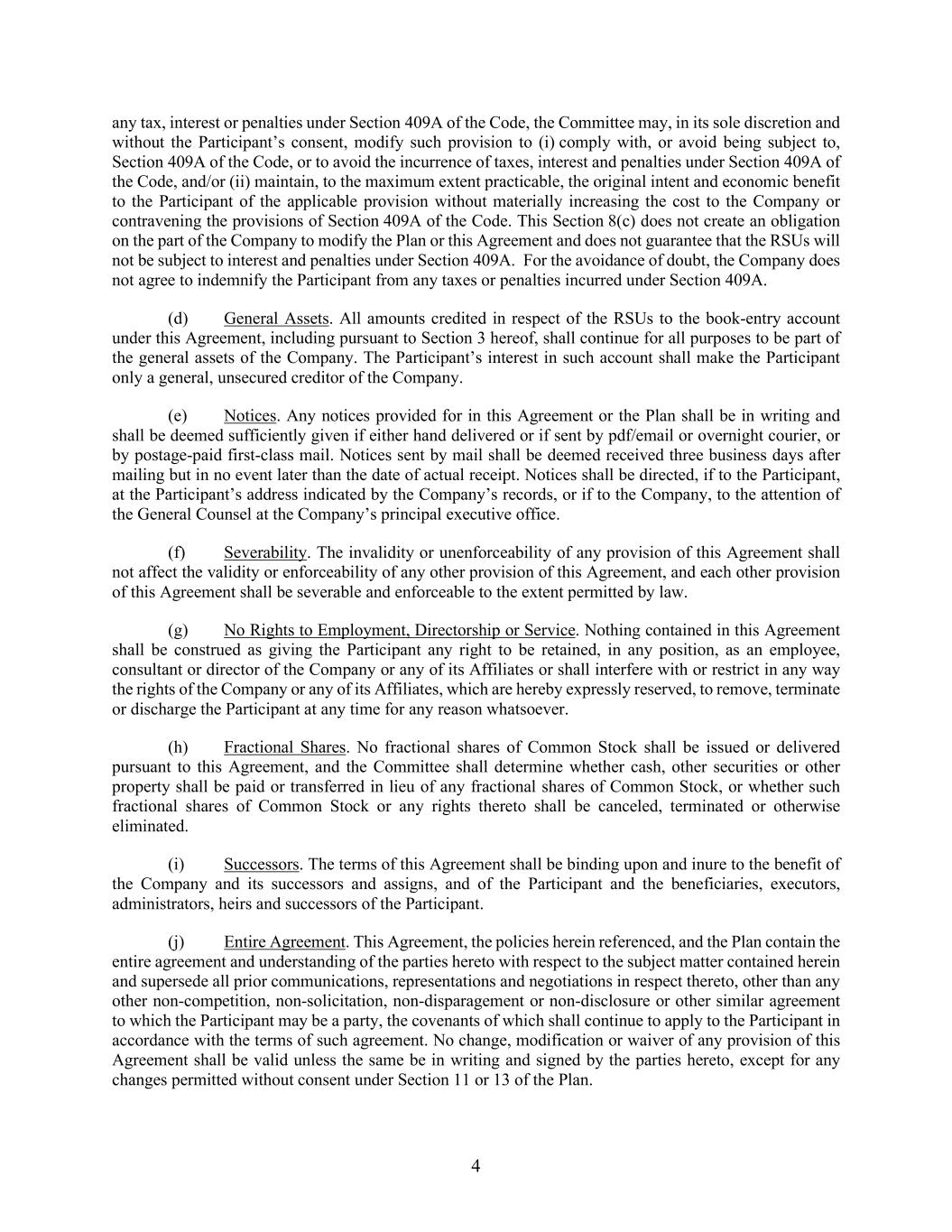 4 any tax, interest or penalties under Section 409A of the Code, the Committee may, in its sole discretion and without the Participant’s consent, modify such provision to (i) comply with, or avoid being subject to, Section 409A of the Code, or to avoid the incurrence of taxes, interest and penalties under Section 409A of the Code, and/or (ii) maintain, to the maximum extent practicable, the original intent and economic benefit to the Participant of the applicable provision without materially increasing the cost to the Company or contravening the provisions of Section 409A of the Code. This Section 8(c) does not create an obligation on the part of the Company to modify the Plan or this Agreement and does not guarantee that the RSUs will not be subject to interest and penalties under Section 409A. For the avoidance of doubt, the Company does not agree to indemnify the Participant from any taxes or penalties incurred under Section 409A. (d) General Assets. All amounts credited in respect of the RSUs to the book-entry account under this Agreement, including pursuant to Section 3 hereof, shall continue for all purposes to be part of the general assets of the Company. The Participant’s interest in such account shall make the Participant only a general, unsecured creditor of the Company. (e) Notices. Any notices provided for in this Agreement or the Plan shall be in writing and shall be deemed sufficiently given if either hand delivered or if sent by pdf/email or overnight courier, or by postage-paid first-class mail. Notices sent by mail shall be deemed received three business days after mailing but in no event later than the date of actual receipt. Notices shall be directed, if to the Participant, at the Participant’s address indicated by the Company’s records, or if to the Company, to the attention of the General Counsel at the Company’s principal executive office. (f) Severability. The invalidity or unenforceability of any provision of this Agreement shall not affect the validity or enforceability of any other provision of this Agreement, and each other provision of this Agreement shall be severable and enforceable to the extent permitted by law. (g) No Rights to Employment, Directorship or Service. Nothing contained in this Agreement shall be construed as giving the Participant any right to be retained, in any position, as an employee, consultant or director of the Company or any of its Affiliates or shall interfere with or restrict in any way the rights of the Company or any of its Affiliates, which are hereby expressly reserved, to remove, terminate or discharge the Participant at any time for any reason whatsoever. (h) Fractional Shares. No fractional shares of Common Stock shall be issued or delivered pursuant to this Agreement, and the Committee shall determine whether cash, other securities or other property shall be paid or transferred in lieu of any fractional shares of Common Stock, or whether such fractional shares of Common Stock or any rights thereto shall be canceled, terminated or otherwise eliminated. (i) Successors. The terms of this Agreement shall be binding upon and inure to the benefit of the Company and its successors and assigns, and of the Participant and the beneficiaries, executors, administrators, heirs and successors of the Participant. (j) Entire Agreement. This Agreement, the policies herein referenced, and the Plan contain the entire agreement and understanding of the parties hereto with respect to the subject matter contained herein and supersede all prior communications, representations and negotiations in respect thereto, other than any other non-competition, non-solicitation, non-disparagement or non-disclosure or other similar agreement to which the Participant may be a party, the covenants of which shall continue to apply to the Participant in accordance with the terms of such agreement. No change, modification or waiver of any provision of this Agreement shall be valid unless the same be in writing and signed by the parties hereto, except for any changes permitted without consent under Section 11 or 13 of the Plan.