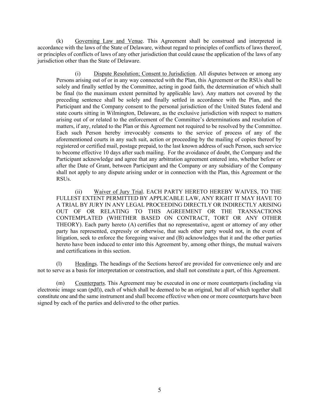 5 (k) Governing Law and Venue. This Agreement shall be construed and interpreted in accordance with the laws of the State of Delaware, without regard to principles of conflicts of laws thereof, or principles of conflicts of laws of any other jurisdiction that could cause the application of the laws of any jurisdiction other than the State of Delaware. (i) Dispute Resolution; Consent to Jurisdiction. All disputes between or among any Persons arising out of or in any way connected with the Plan, this Agreement or the RSUs shall be solely and finally settled by the Committee, acting in good faith, the determination of which shall be final (to the maximum extent permitted by applicable law). Any matters not covered by the preceding sentence shall be solely and finally settled in accordance with the Plan, and the Participant and the Company consent to the personal jurisdiction of the United States federal and state courts sitting in Wilmington, Delaware, as the exclusive jurisdiction with respect to matters arising out of or related to the enforcement of the Committee’s determinations and resolution of matters, if any, related to the Plan or this Agreement not required to be resolved by the Committee. Each such Person hereby irrevocably consents to the service of process of any of the aforementioned courts in any such suit, action or proceeding by the mailing of copies thereof by registered or certified mail, postage prepaid, to the last known address of such Person, such service to become effective 10 days after such mailing. For the avoidance of doubt, the Company and the Participant acknowledge and agree that any arbitration agreement entered into, whether before or after the Date of Grant, between Participant and the Company or any subsidiary of the Company shall not apply to any dispute arising under or in connection with the Plan, this Agreement or the RSUs. (ii) Waiver of Jury Trial. EACH PARTY HERETO HEREBY WAIVES, TO THE FULLEST EXTENT PERMITTED BY APPLICABLE LAW, ANY RIGHT IT MAY HAVE TO A TRIAL BY JURY IN ANY LEGAL PROCEEDING DIRECTLY OR INDIRECTLY ARISING OUT OF OR RELATING TO THIS AGREEMENT OR THE TRANSACTIONS CONTEMPLATED (WHETHER BASED ON CONTRACT, TORT OR ANY OTHER THEORY). Each party hereto (A) certifies that no representative, agent or attorney of any other party has represented, expressly or otherwise, that such other party would not, in the event of litigation, seek to enforce the foregoing waiver and (B) acknowledges that it and the other parties hereto have been induced to enter into this Agreement by, among other things, the mutual waivers and certifications in this section. (l) Headings. The headings of the Sections hereof are provided for convenience only and are not to serve as a basis for interpretation or construction, and shall not constitute a part, of this Agreement. (m) Counterparts. This Agreement may be executed in one or more counterparts (including via electronic image scan (pdf)), each of which shall be deemed to be an original, but all of which together shall constitute one and the same instrument and shall become effective when one or more counterparts have been signed by each of the parties and delivered to the other parties.