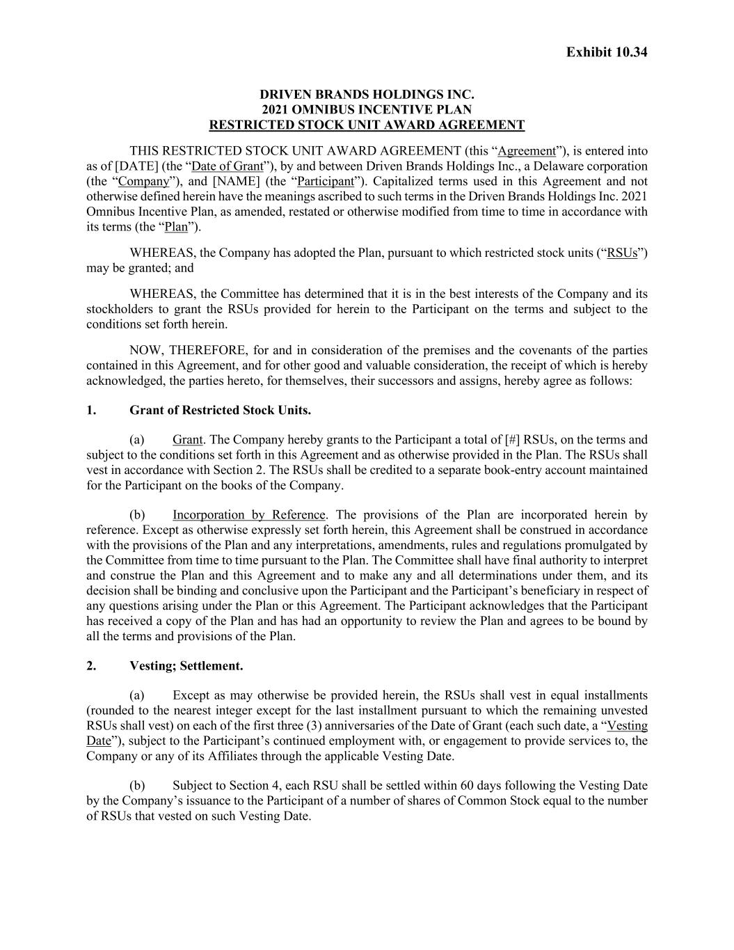 Exhibit 10.34 DRIVEN BRANDS HOLDINGS INC. 2021 OMNIBUS INCENTIVE PLAN RESTRICTED STOCK UNIT AWARD AGREEMENT THIS RESTRICTED STOCK UNIT AWARD AGREEMENT (this “Agreement”), is entered into as of [DATE] (the “Date of Grant”), by and between Driven Brands Holdings Inc., a Delaware corporation (the “Company”), and [NAME] (the “Participant”). Capitalized terms used in this Agreement and not otherwise defined herein have the meanings ascribed to such terms in the Driven Brands Holdings Inc. 2021 Omnibus Incentive Plan, as amended, restated or otherwise modified from time to time in accordance with its terms (the “Plan”). WHEREAS, the Company has adopted the Plan, pursuant to which restricted stock units (“RSUs”) may be granted; and WHEREAS, the Committee has determined that it is in the best interests of the Company and its stockholders to grant the RSUs provided for herein to the Participant on the terms and subject to the conditions set forth herein. NOW, THEREFORE, for and in consideration of the premises and the covenants of the parties contained in this Agreement, and for other good and valuable consideration, the receipt of which is hereby acknowledged, the parties hereto, for themselves, their successors and assigns, hereby agree as follows: 1. Grant of Restricted Stock Units. (a) Grant. The Company hereby grants to the Participant a total of [#] RSUs, on the terms and subject to the conditions set forth in this Agreement and as otherwise provided in the Plan. The RSUs shall vest in accordance with Section 2. The RSUs shall be credited to a separate book-entry account maintained for the Participant on the books of the Company. (b) Incorporation by Reference. The provisions of the Plan are incorporated herein by reference. Except as otherwise expressly set forth herein, this Agreement shall be construed in accordance with the provisions of the Plan and any interpretations, amendments, rules and regulations promulgated by the Committee from time to time pursuant to the Plan. The Committee shall have final authority to interpret and construe the Plan and this Agreement and to make any and all determinations under them, and its decision shall be binding and conclusive upon the Participant and the Participant’s beneficiary in respect of any questions arising under the Plan or this Agreement. The Participant acknowledges that the Participant has received a copy of the Plan and has had an opportunity to review the Plan and agrees to be bound by all the terms and provisions of the Plan. 2. Vesting; Settlement. (a) Except as may otherwise be provided herein, the RSUs shall vest in equal installments (rounded to the nearest integer except for the last installment pursuant to which the remaining unvested RSUs shall vest) on each of the first three (3) anniversaries of the Date of Grant (each such date, a “Vesting Date”), subject to the Participant’s continued employment with, or engagement to provide services to, the Company or any of its Affiliates through the applicable Vesting Date. (b) Subject to Section 4, each RSU shall be settled within 60 days following the Vesting Date by the Company’s issuance to the Participant of a number of shares of Common Stock equal to the number of RSUs that vested on such Vesting Date.