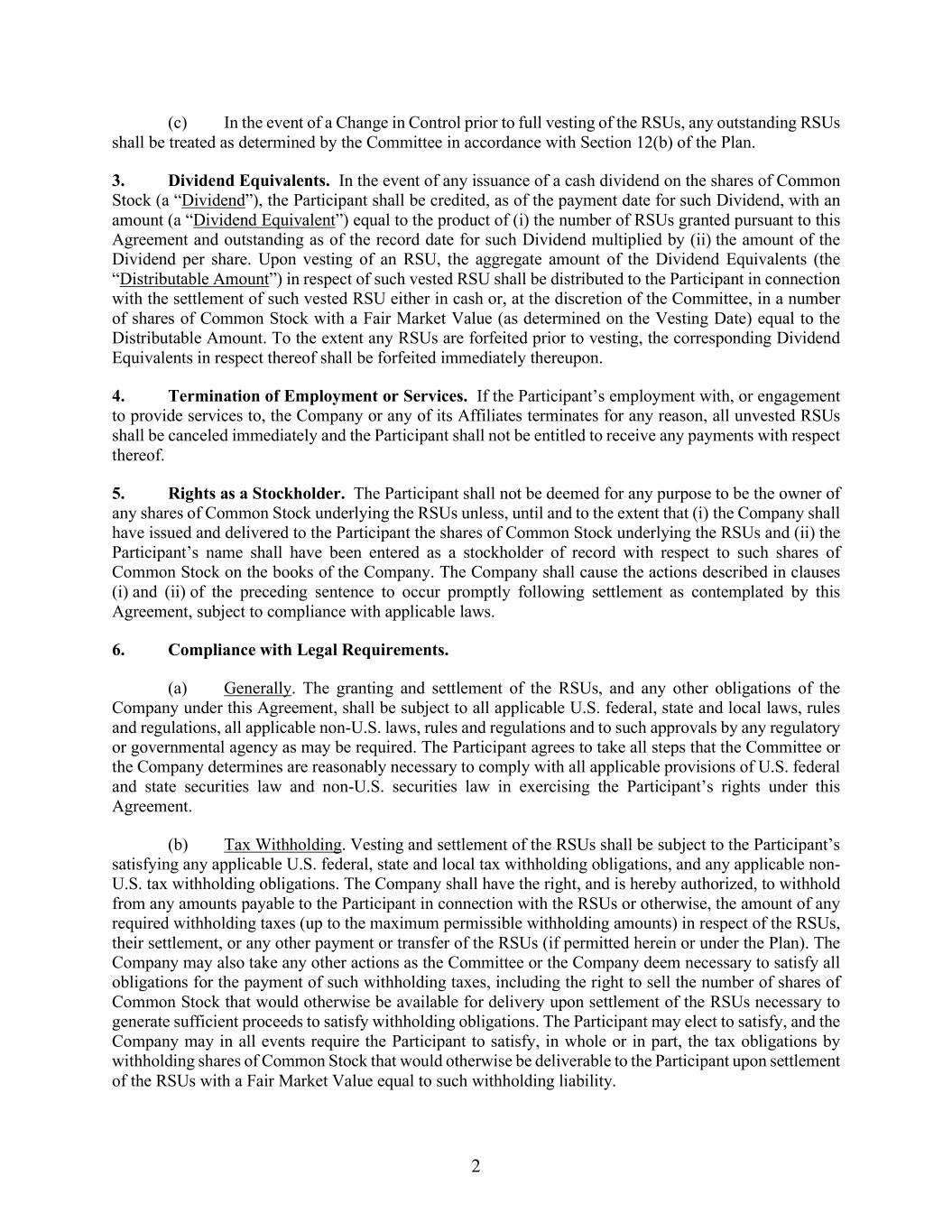 2 (c) In the event of a Change in Control prior to full vesting of the RSUs, any outstanding RSUs shall be treated as determined by the Committee in accordance with Section 12(b) of the Plan. 3. Dividend Equivalents. In the event of any issuance of a cash dividend on the shares of Common Stock (a “Dividend”), the Participant shall be credited, as of the payment date for such Dividend, with an amount (a “Dividend Equivalent”) equal to the product of (i) the number of RSUs granted pursuant to this Agreement and outstanding as of the record date for such Dividend multiplied by (ii) the amount of the Dividend per share. Upon vesting of an RSU, the aggregate amount of the Dividend Equivalents (the “Distributable Amount”) in respect of such vested RSU shall be distributed to the Participant in connection with the settlement of such vested RSU either in cash or, at the discretion of the Committee, in a number of shares of Common Stock with a Fair Market Value (as determined on the Vesting Date) equal to the Distributable Amount. To the extent any RSUs are forfeited prior to vesting, the corresponding Dividend Equivalents in respect thereof shall be forfeited immediately thereupon. 4. Termination of Employment or Services. If the Participant’s employment with, or engagement to provide services to, the Company or any of its Affiliates terminates for any reason, all unvested RSUs shall be canceled immediately and the Participant shall not be entitled to receive any payments with respect thereof. 5. Rights as a Stockholder. The Participant shall not be deemed for any purpose to be the owner of any shares of Common Stock underlying the RSUs unless, until and to the extent that (i) the Company shall have issued and delivered to the Participant the shares of Common Stock underlying the RSUs and (ii) the Participant’s name shall have been entered as a stockholder of record with respect to such shares of Common Stock on the books of the Company. The Company shall cause the actions described in clauses (i) and (ii) of the preceding sentence to occur promptly following settlement as contemplated by this Agreement, subject to compliance with applicable laws. 6. Compliance with Legal Requirements. (a) Generally. The granting and settlement of the RSUs, and any other obligations of the Company under this Agreement, shall be subject to all applicable U.S. federal, state and local laws, rules and regulations, all applicable non-U.S. laws, rules and regulations and to such approvals by any regulatory or governmental agency as may be required. The Participant agrees to take all steps that the Committee or the Company determines are reasonably necessary to comply with all applicable provisions of U.S. federal and state securities law and non-U.S. securities law in exercising the Participant’s rights under this Agreement. (b) Tax Withholding. Vesting and settlement of the RSUs shall be subject to the Participant’s satisfying any applicable U.S. federal, state and local tax withholding obligations, and any applicable non- U.S. tax withholding obligations. The Company shall have the right, and is hereby authorized, to withhold from any amounts payable to the Participant in connection with the RSUs or otherwise, the amount of any required withholding taxes (up to the maximum permissible withholding amounts) in respect of the RSUs, their settlement, or any other payment or transfer of the RSUs (if permitted herein or under the Plan). The Company may also take any other actions as the Committee or the Company deem necessary to satisfy all obligations for the payment of such withholding taxes, including the right to sell the number of shares of Common Stock that would otherwise be available for delivery upon settlement of the RSUs necessary to generate sufficient proceeds to satisfy withholding obligations. The Participant may elect to satisfy, and the Company may in all events require the Participant to satisfy, in whole or in part, the tax obligations by withholding shares of Common Stock that would otherwise be deliverable to the Participant upon settlement of the RSUs with a Fair Market Value equal to such withholding liability.