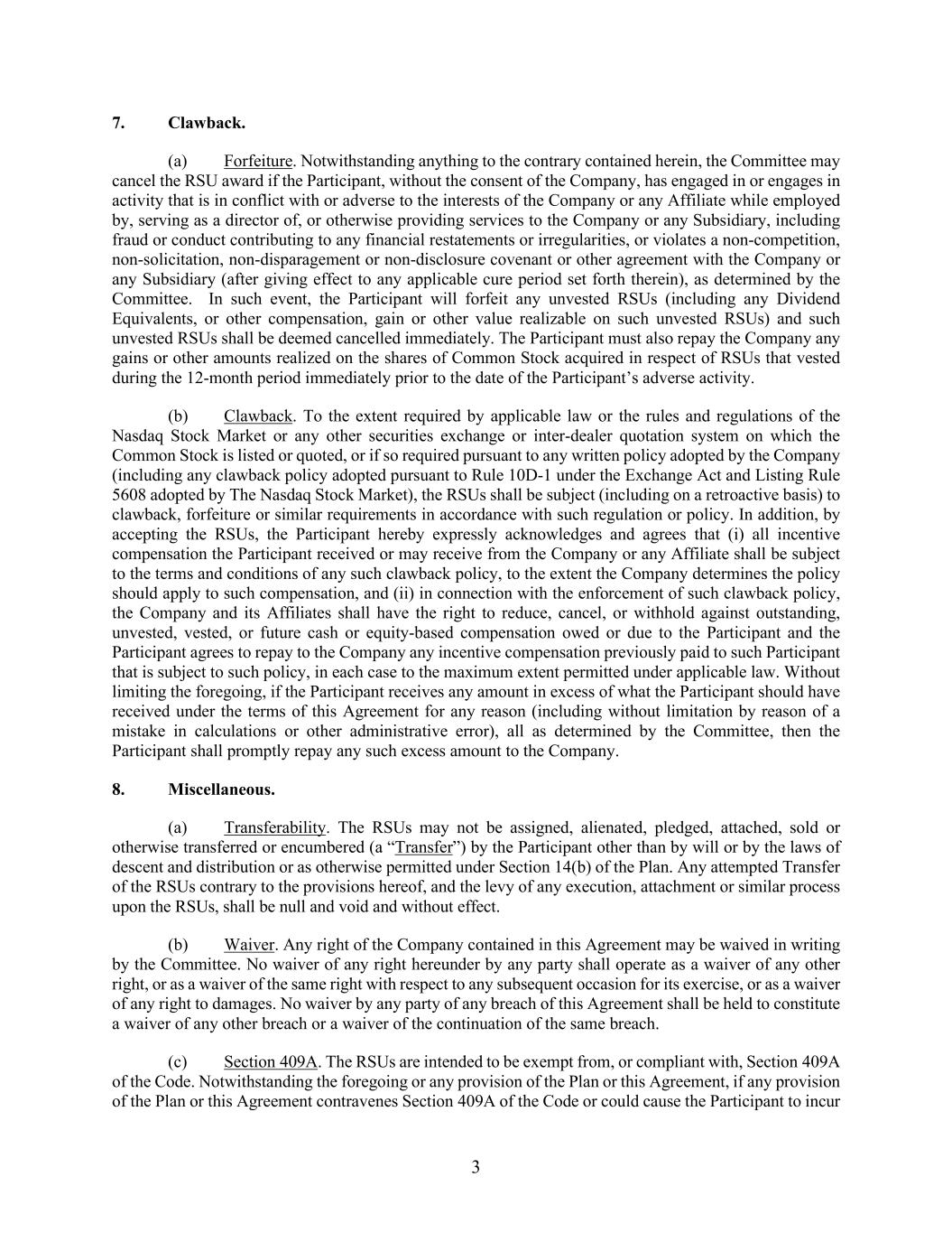 3 7. Clawback. (a) Forfeiture. Notwithstanding anything to the contrary contained herein, the Committee may cancel the RSU award if the Participant, without the consent of the Company, has engaged in or engages in activity that is in conflict with or adverse to the interests of the Company or any Affiliate while employed by, serving as a director of, or otherwise providing services to the Company or any Subsidiary, including fraud or conduct contributing to any financial restatements or irregularities, or violates a non-competition, non-solicitation, non-disparagement or non-disclosure covenant or other agreement with the Company or any Subsidiary (after giving effect to any applicable cure period set forth therein), as determined by the Committee. In such event, the Participant will forfeit any unvested RSUs (including any Dividend Equivalents, or other compensation, gain or other value realizable on such unvested RSUs) and such unvested RSUs shall be deemed cancelled immediately. The Participant must also repay the Company any gains or other amounts realized on the shares of Common Stock acquired in respect of RSUs that vested during the 12-month period immediately prior to the date of the Participant’s adverse activity. (b) Clawback. To the extent required by applicable law or the rules and regulations of the Nasdaq Stock Market or any other securities exchange or inter-dealer quotation system on which the Common Stock is listed or quoted, or if so required pursuant to any written policy adopted by the Company (including any clawback policy adopted pursuant to Rule 10D-1 under the Exchange Act and Listing Rule 5608 adopted by The Nasdaq Stock Market), the RSUs shall be subject (including on a retroactive basis) to clawback, forfeiture or similar requirements in accordance with such regulation or policy. In addition, by accepting the RSUs, the Participant hereby expressly acknowledges and agrees that (i) all incentive compensation the Participant received or may receive from the Company or any Affiliate shall be subject to the terms and conditions of any such clawback policy, to the extent the Company determines the policy should apply to such compensation, and (ii) in connection with the enforcement of such clawback policy, the Company and its Affiliates shall have the right to reduce, cancel, or withhold against outstanding, unvested, vested, or future cash or equity-based compensation owed or due to the Participant and the Participant agrees to repay to the Company any incentive compensation previously paid to such Participant that is subject to such policy, in each case to the maximum extent permitted under applicable law. Without limiting the foregoing, if the Participant receives any amount in excess of what the Participant should have received under the terms of this Agreement for any reason (including without limitation by reason of a mistake in calculations or other administrative error), all as determined by the Committee, then the Participant shall promptly repay any such excess amount to the Company. 8. Miscellaneous. (a) Transferability. The RSUs may not be assigned, alienated, pledged, attached, sold or otherwise transferred or encumbered (a “Transfer”) by the Participant other than by will or by the laws of descent and distribution or as otherwise permitted under Section 14(b) of the Plan. Any attempted Transfer of the RSUs contrary to the provisions hereof, and the levy of any execution, attachment or similar process upon the RSUs, shall be null and void and without effect. (b) Waiver. Any right of the Company contained in this Agreement may be waived in writing by the Committee. No waiver of any right hereunder by any party shall operate as a waiver of any other right, or as a waiver of the same right with respect to any subsequent occasion for its exercise, or as a waiver of any right to damages. No waiver by any party of any breach of this Agreement shall be held to constitute a waiver of any other breach or a waiver of the continuation of the same breach. (c) Section 409A. The RSUs are intended to be exempt from, or compliant with, Section 409A of the Code. Notwithstanding the foregoing or any provision of the Plan or this Agreement, if any provision of the Plan or this Agreement contravenes Section 409A of the Code or could cause the Participant to incur