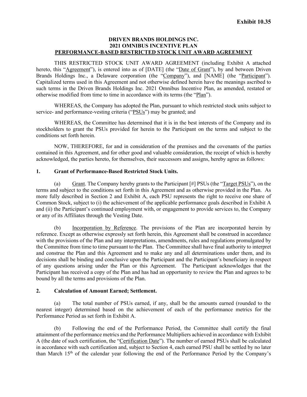 Exhibit 10.35 DRIVEN BRANDS HOLDINGS INC. 2021 OMNIBUS INCENTIVE PLAN PERFORMANCE-BASED RESTRICTED STOCK UNIT AWARD AGREEMENT THIS RESTRICTED STOCK UNIT AWARD AGREEMENT (including Exhibit A attached hereto, this “Agreement”), is entered into as of [DATE] (the “Date of Grant”), by and between Driven Brands Holdings Inc., a Delaware corporation (the “Company”), and [NAME] (the “Participant”). Capitalized terms used in this Agreement and not otherwise defined herein have the meanings ascribed to such terms in the Driven Brands Holdings Inc. 2021 Omnibus Incentive Plan, as amended, restated or otherwise modified from time to time in accordance with its terms (the “Plan”). WHEREAS, the Company has adopted the Plan, pursuant to which restricted stock units subject to service- and performance-vesting criteria (“PSUs”) may be granted; and WHEREAS, the Committee has determined that it is in the best interests of the Company and its stockholders to grant the PSUs provided for herein to the Participant on the terms and subject to the conditions set forth herein. NOW, THEREFORE, for and in consideration of the premises and the covenants of the parties contained in this Agreement, and for other good and valuable consideration, the receipt of which is hereby acknowledged, the parties hereto, for themselves, their successors and assigns, hereby agree as follows: 1. Grant of Performance-Based Restricted Stock Units. (a) Grant. The Company hereby grants to the Participant [#] PSUs (the “Target PSUs”), on the terms and subject to the conditions set forth in this Agreement and as otherwise provided in the Plan. As more fully described in Section 2 and Exhibit A, each PSU represents the right to receive one share of Common Stock, subject to (i) the achievement of the applicable performance goals described in Exhibit A and (ii) the Participant’s continued employment with, or engagement to provide services to, the Company or any of its Affiliates through the Vesting Date. (b) Incorporation by Reference. The provisions of the Plan are incorporated herein by reference. Except as otherwise expressly set forth herein, this Agreement shall be construed in accordance with the provisions of the Plan and any interpretations, amendments, rules and regulations promulgated by the Committee from time to time pursuant to the Plan. The Committee shall have final authority to interpret and construe the Plan and this Agreement and to make any and all determinations under them, and its decisions shall be binding and conclusive upon the Participant and the Participant’s beneficiary in respect of any questions arising under the Plan or this Agreement. The Participant acknowledges that the Participant has received a copy of the Plan and has had an opportunity to review the Plan and agrees to be bound by all the terms and provisions of the Plan. 2. Calculation of Amount Earned; Settlement. (a) The total number of PSUs earned, if any, shall be the amounts earned (rounded to the nearest integer) determined based on the achievement of each of the performance metrics for the Performance Period as set forth in Exhibit A. (b) Following the end of the Performance Period, the Committee shall certify the final attainment of the performance metrics and the Performance Multipliers achieved in accordance with Exhibit A (the date of such certification, the “Certification Date”). The number of earned PSUs shall be calculated in accordance with such certification and, subject to Section 4, each earned PSU shall be settled by no later than March 15th of the calendar year following the end of the Performance Period by the Company’s