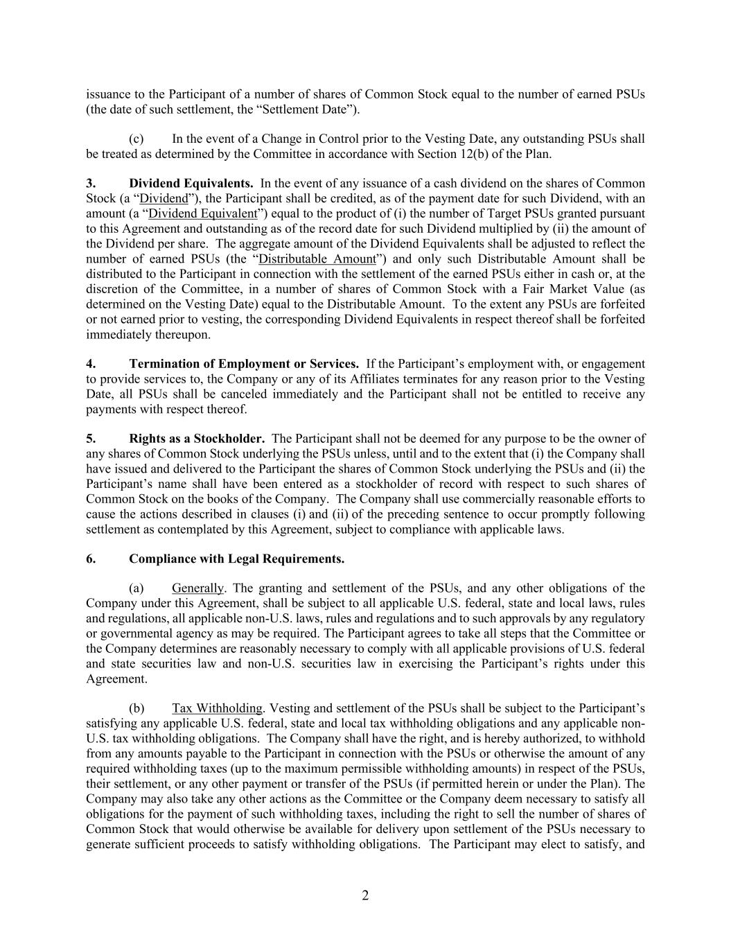 2 issuance to the Participant of a number of shares of Common Stock equal to the number of earned PSUs (the date of such settlement, the “Settlement Date”). (c) In the event of a Change in Control prior to the Vesting Date, any outstanding PSUs shall be treated as determined by the Committee in accordance with Section 12(b) of the Plan. 3. Dividend Equivalents. In the event of any issuance of a cash dividend on the shares of Common Stock (a “Dividend”), the Participant shall be credited, as of the payment date for such Dividend, with an amount (a “Dividend Equivalent”) equal to the product of (i) the number of Target PSUs granted pursuant to this Agreement and outstanding as of the record date for such Dividend multiplied by (ii) the amount of the Dividend per share. The aggregate amount of the Dividend Equivalents shall be adjusted to reflect the number of earned PSUs (the “Distributable Amount”) and only such Distributable Amount shall be distributed to the Participant in connection with the settlement of the earned PSUs either in cash or, at the discretion of the Committee, in a number of shares of Common Stock with a Fair Market Value (as determined on the Vesting Date) equal to the Distributable Amount. To the extent any PSUs are forfeited or not earned prior to vesting, the corresponding Dividend Equivalents in respect thereof shall be forfeited immediately thereupon. 4. Termination of Employment or Services. If the Participant’s employment with, or engagement to provide services to, the Company or any of its Affiliates terminates for any reason prior to the Vesting Date, all PSUs shall be canceled immediately and the Participant shall not be entitled to receive any payments with respect thereof. 5. Rights as a Stockholder. The Participant shall not be deemed for any purpose to be the owner of any shares of Common Stock underlying the PSUs unless, until and to the extent that (i) the Company shall have issued and delivered to the Participant the shares of Common Stock underlying the PSUs and (ii) the Participant’s name shall have been entered as a stockholder of record with respect to such shares of Common Stock on the books of the Company. The Company shall use commercially reasonable efforts to cause the actions described in clauses (i) and (ii) of the preceding sentence to occur promptly following settlement as contemplated by this Agreement, subject to compliance with applicable laws. 6. Compliance with Legal Requirements. (a) Generally. The granting and settlement of the PSUs, and any other obligations of the Company under this Agreement, shall be subject to all applicable U.S. federal, state and local laws, rules and regulations, all applicable non-U.S. laws, rules and regulations and to such approvals by any regulatory or governmental agency as may be required. The Participant agrees to take all steps that the Committee or the Company determines are reasonably necessary to comply with all applicable provisions of U.S. federal and state securities law and non-U.S. securities law in exercising the Participant’s rights under this Agreement. (b) Tax Withholding. Vesting and settlement of the PSUs shall be subject to the Participant’s satisfying any applicable U.S. federal, state and local tax withholding obligations and any applicable non- U.S. tax withholding obligations. The Company shall have the right, and is hereby authorized, to withhold from any amounts payable to the Participant in connection with the PSUs or otherwise the amount of any required withholding taxes (up to the maximum permissible withholding amounts) in respect of the PSUs, their settlement, or any other payment or transfer of the PSUs (if permitted herein or under the Plan). The Company may also take any other actions as the Committee or the Company deem necessary to satisfy all obligations for the payment of such withholding taxes, including the right to sell the number of shares of Common Stock that would otherwise be available for delivery upon settlement of the PSUs necessary to generate sufficient proceeds to satisfy withholding obligations. The Participant may elect to satisfy, and