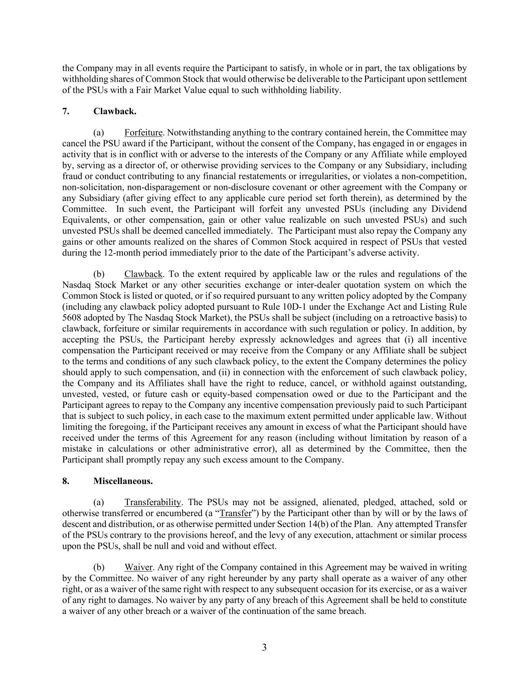 3 the Company may in all events require the Participant to satisfy, in whole or in part, the tax obligations by withholding shares of Common Stock that would otherwise be deliverable to the Participant upon settlement of the PSUs with a Fair Market Value equal to such withholding liability. 7. Clawback. (a) Forfeiture. Notwithstanding anything to the contrary contained herein, the Committee may cancel the PSU award if the Participant, without the consent of the Company, has engaged in or engages in activity that is in conflict with or adverse to the interests of the Company or any Affiliate while employed by, serving as a director of, or otherwise providing services to the Company or any Subsidiary, including fraud or conduct contributing to any financial restatements or irregularities, or violates a non-competition, non-solicitation, non-disparagement or non-disclosure covenant or other agreement with the Company or any Subsidiary (after giving effect to any applicable cure period set forth therein), as determined by the Committee. In such event, the Participant will forfeit any unvested PSUs (including any Dividend Equivalents, or other compensation, gain or other value realizable on such unvested PSUs) and such unvested PSUs shall be deemed cancelled immediately. The Participant must also repay the Company any gains or other amounts realized on the shares of Common Stock acquired in respect of PSUs that vested during the 12-month period immediately prior to the date of the Participant’s adverse activity. (b) Clawback. To the extent required by applicable law or the rules and regulations of the Nasdaq Stock Market or any other securities exchange or inter-dealer quotation system on which the Common Stock is listed or quoted, or if so required pursuant to any written policy adopted by the Company (including any clawback policy adopted pursuant to Rule 10D-1 under the Exchange Act and Listing Rule 5608 adopted by The Nasdaq Stock Market), the PSUs shall be subject (including on a retroactive basis) to clawback, forfeiture or similar requirements in accordance with such regulation or policy. In addition, by accepting the PSUs, the Participant hereby expressly acknowledges and agrees that (i) all incentive compensation the Participant received or may receive from the Company or any Affiliate shall be subject to the terms and conditions of any such clawback policy, to the extent the Company determines the policy should apply to such compensation, and (ii) in connection with the enforcement of such clawback policy, the Company and its Affiliates shall have the right to reduce, cancel, or withhold against outstanding, unvested, vested, or future cash or equity-based compensation owed or due to the Participant and the Participant agrees to repay to the Company any incentive compensation previously paid to such Participant that is subject to such policy, in each case to the maximum extent permitted under applicable law. Without limiting the foregoing, if the Participant receives any amount in excess of what the Participant should have received under the terms of this Agreement for any reason (including without limitation by reason of a mistake in calculations or other administrative error), all as determined by the Committee, then the Participant shall promptly repay any such excess amount to the Company. 8. Miscellaneous. (a) Transferability. The PSUs may not be assigned, alienated, pledged, attached, sold or otherwise transferred or encumbered (a “Transfer”) by the Participant other than by will or by the laws of descent and distribution, or as otherwise permitted under Section 14(b) of the Plan. Any attempted Transfer of the PSUs contrary to the provisions hereof, and the levy of any execution, attachment or similar process upon the PSUs, shall be null and void and without effect. (b) Waiver. Any right of the Company contained in this Agreement may be waived in writing by the Committee. No waiver of any right hereunder by any party shall operate as a waiver of any other right, or as a waiver of the same right with respect to any subsequent occasion for its exercise, or as a waiver of any right to damages. No waiver by any party of any breach of this Agreement shall be held to constitute a waiver of any other breach or a waiver of the continuation of the same breach.