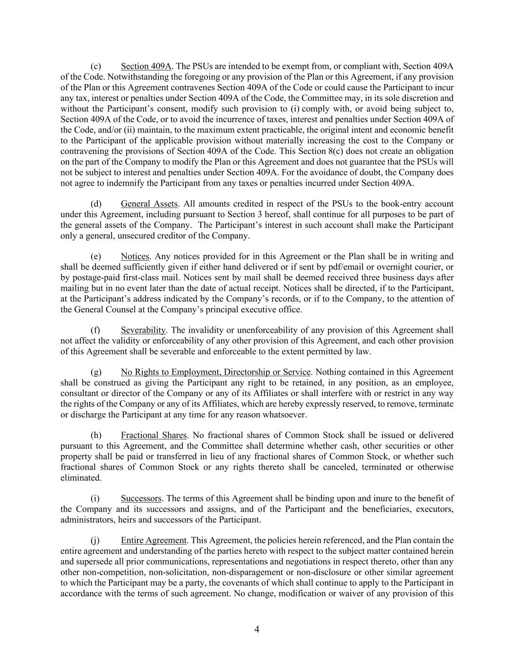 4 (c) Section 409A. The PSUs are intended to be exempt from, or compliant with, Section 409A of the Code. Notwithstanding the foregoing or any provision of the Plan or this Agreement, if any provision of the Plan or this Agreement contravenes Section 409A of the Code or could cause the Participant to incur any tax, interest or penalties under Section 409A of the Code, the Committee may, in its sole discretion and without the Participant’s consent, modify such provision to (i) comply with, or avoid being subject to, Section 409A of the Code, or to avoid the incurrence of taxes, interest and penalties under Section 409A of the Code, and/or (ii) maintain, to the maximum extent practicable, the original intent and economic benefit to the Participant of the applicable provision without materially increasing the cost to the Company or contravening the provisions of Section 409A of the Code. This Section 8(c) does not create an obligation on the part of the Company to modify the Plan or this Agreement and does not guarantee that the PSUs will not be subject to interest and penalties under Section 409A. For the avoidance of doubt, the Company does not agree to indemnify the Participant from any taxes or penalties incurred under Section 409A. (d) General Assets. All amounts credited in respect of the PSUs to the book-entry account under this Agreement, including pursuant to Section 3 hereof, shall continue for all purposes to be part of the general assets of the Company. The Participant’s interest in such account shall make the Participant only a general, unsecured creditor of the Company. (e) Notices. Any notices provided for in this Agreement or the Plan shall be in writing and shall be deemed sufficiently given if either hand delivered or if sent by pdf/email or overnight courier, or by postage-paid first-class mail. Notices sent by mail shall be deemed received three business days after mailing but in no event later than the date of actual receipt. Notices shall be directed, if to the Participant, at the Participant’s address indicated by the Company’s records, or if to the Company, to the attention of the General Counsel at the Company’s principal executive office. (f) Severability. The invalidity or unenforceability of any provision of this Agreement shall not affect the validity or enforceability of any other provision of this Agreement, and each other provision of this Agreement shall be severable and enforceable to the extent permitted by law. (g) No Rights to Employment, Directorship or Service. Nothing contained in this Agreement shall be construed as giving the Participant any right to be retained, in any position, as an employee, consultant or director of the Company or any of its Affiliates or shall interfere with or restrict in any way the rights of the Company or any of its Affiliates, which are hereby expressly reserved, to remove, terminate or discharge the Participant at any time for any reason whatsoever. (h) Fractional Shares. No fractional shares of Common Stock shall be issued or delivered pursuant to this Agreement, and the Committee shall determine whether cash, other securities or other property shall be paid or transferred in lieu of any fractional shares of Common Stock, or whether such fractional shares of Common Stock or any rights thereto shall be canceled, terminated or otherwise eliminated. (i) Successors. The terms of this Agreement shall be binding upon and inure to the benefit of the Company and its successors and assigns, and of the Participant and the beneficiaries, executors, administrators, heirs and successors of the Participant. (j) Entire Agreement. This Agreement, the policies herein referenced, and the Plan contain the entire agreement and understanding of the parties hereto with respect to the subject matter contained herein and supersede all prior communications, representations and negotiations in respect thereto, other than any other non-competition, non-solicitation, non-disparagement or non-disclosure or other similar agreement to which the Participant may be a party, the covenants of which shall continue to apply to the Participant in accordance with the terms of such agreement. No change, modification or waiver of any provision of this