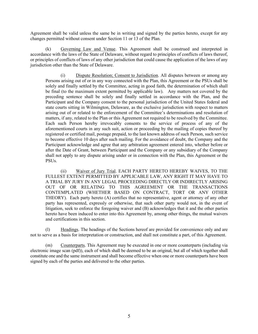 5 Agreement shall be valid unless the same be in writing and signed by the parties hereto, except for any changes permitted without consent under Section 11 or 13 of the Plan. (k) Governing Law and Venue. This Agreement shall be construed and interpreted in accordance with the laws of the State of Delaware, without regard to principles of conflicts of laws thereof, or principles of conflicts of laws of any other jurisdiction that could cause the application of the laws of any jurisdiction other than the State of Delaware. (i) Dispute Resolution; Consent to Jurisdiction. All disputes between or among any Persons arising out of or in any way connected with the Plan, this Agreement or the PSUs shall be solely and finally settled by the Committee, acting in good faith, the determination of which shall be final (to the maximum extent permitted by applicable law). Any matters not covered by the preceding sentence shall be solely and finally settled in accordance with the Plan, and the Participant and the Company consent to the personal jurisdiction of the United States federal and state courts sitting in Wilmington, Delaware, as the exclusive jurisdiction with respect to matters arising out of or related to the enforcement of the Committee’s determinations and resolution of matters, if any, related to the Plan or this Agreement not required to be resolved by the Committee. Each such Person hereby irrevocably consents to the service of process of any of the aforementioned courts in any such suit, action or proceeding by the mailing of copies thereof by registered or certified mail, postage prepaid, to the last known address of such Person, such service to become effective 10 days after such mailing. For the avoidance of doubt, the Company and the Participant acknowledge and agree that any arbitration agreement entered into, whether before or after the Date of Grant, between Participant and the Company or any subsidiary of the Company shall not apply to any dispute arising under or in connection with the Plan, this Agreement or the PSUs. (ii) Waiver of Jury Trial. EACH PARTY HERETO HEREBY WAIVES, TO THE FULLEST EXTENT PERMITTED BY APPLICABLE LAW, ANY RIGHT IT MAY HAVE TO A TRIAL BY JURY IN ANY LEGAL PROCEEDING DIRECTLY OR INDIRECTLY ARISING OUT OF OR RELATING TO THIS AGREEMENT OR THE TRANSACTIONS CONTEMPLATED (WHETHER BASED ON CONTRACT, TORT OR ANY OTHER THEORY). Each party hereto (A) certifies that no representative, agent or attorney of any other party has represented, expressly or otherwise, that such other party would not, in the event of litigation, seek to enforce the foregoing waiver and (B) acknowledges that it and the other parties hereto have been induced to enter into this Agreement by, among other things, the mutual waivers and certifications in this section. (l) Headings. The headings of the Sections hereof are provided for convenience only and are not to serve as a basis for interpretation or construction, and shall not constitute a part, of this Agreement. (m) Counterparts. This Agreement may be executed in one or more counterparts (including via electronic image scan (pdf)), each of which shall be deemed to be an original, but all of which together shall constitute one and the same instrument and shall become effective when one or more counterparts have been signed by each of the parties and delivered to the other parties.