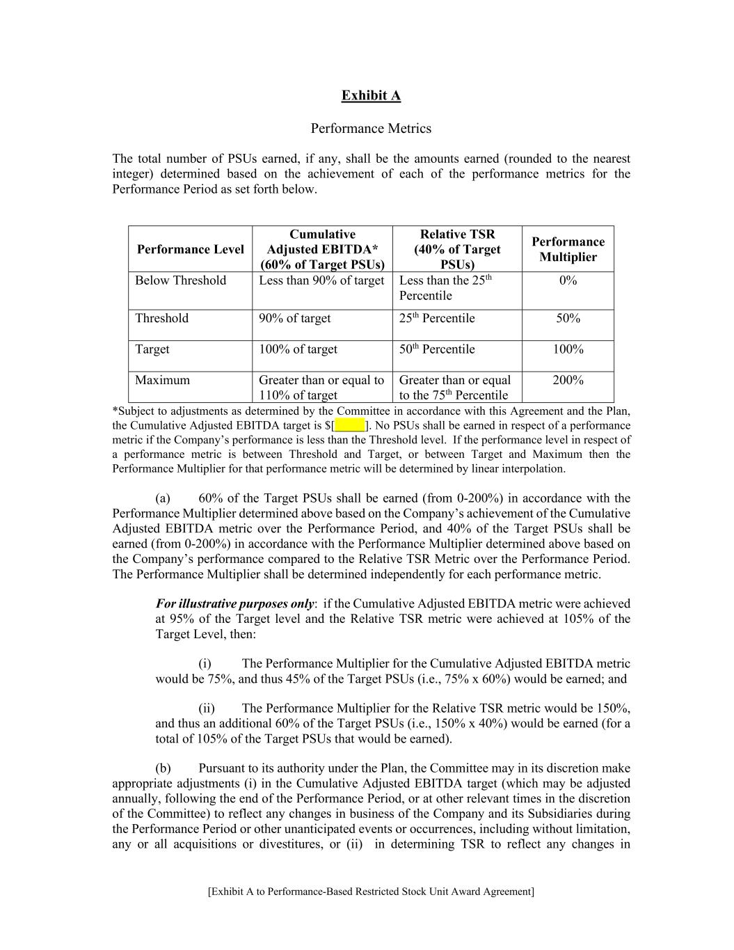 [Exhibit A to Performance-Based Restricted Stock Unit Award Agreement] Exhibit A Performance Metrics The total number of PSUs earned, if any, shall be the amounts earned (rounded to the nearest integer) determined based on the achievement of each of the performance metrics for the Performance Period as set forth below. Performance Level Cumulative Adjusted EBITDA* (60% of Target PSUs) Relative TSR (40% of Target PSUs) Performance Multiplier Below Threshold Less than 90% of target Less than the 25th Percentile 0% Threshold 90% of target 25th Percentile 50% Target 100% of target 50th Percentile 100% Maximum Greater than or equal to 110% of target Greater than or equal to the 75th Percentile 200% *Subject to adjustments as determined by the Committee in accordance with this Agreement and the Plan, the Cumulative Adjusted EBITDA target is $[_____]. No PSUs shall be earned in respect of a performance metric if the Company’s performance is less than the Threshold level. If the performance level in respect of a performance metric is between Threshold and Target, or between Target and Maximum then the Performance Multiplier for that performance metric will be determined by linear interpolation. (a) 60% of the Target PSUs shall be earned (from 0-200%) in accordance with the Performance Multiplier determined above based on the Company’s achievement of the Cumulative Adjusted EBITDA metric over the Performance Period, and 40% of the Target PSUs shall be earned (from 0-200%) in accordance with the Performance Multiplier determined above based on the Company’s performance compared to the Relative TSR Metric over the Performance Period. The Performance Multiplier shall be determined independently for each performance metric. For illustrative purposes only: if the Cumulative Adjusted EBITDA metric were achieved at 95% of the Target level and the Relative TSR metric were achieved at 105% of the Target Level, then: (i) The Performance Multiplier for the Cumulative Adjusted EBITDA metric would be 75%, and thus 45% of the Target PSUs (i.e., 75% x 60%) would be earned; and (ii) The Performance Multiplier for the Relative TSR metric would be 150%, and thus an additional 60% of the Target PSUs (i.e., 150% x 40%) would be earned (for a total of 105% of the Target PSUs that would be earned). (b) Pursuant to its authority under the Plan, the Committee may in its discretion make appropriate adjustments (i) in the Cumulative Adjusted EBITDA target (which may be adjusted annually, following the end of the Performance Period, or at other relevant times in the discretion of the Committee) to reflect any changes in business of the Company and its Subsidiaries during the Performance Period or other unanticipated events or occurrences, including without limitation, any or all acquisitions or divestitures, or (ii) in determining TSR to reflect any changes in