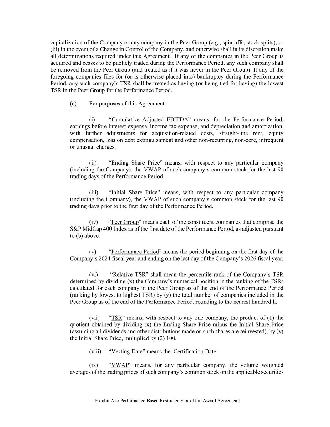[Exhibit A to Performance-Based Restricted Stock Unit Award Agreement] capitalization of the Company or any company in the Peer Group (e.g., spin-offs, stock splits), or (iii) in the event of a Change in Control of the Company, and otherwise shall in its discretion make all determinations required under this Agreement. If any of the companies in the Peer Group is acquired and ceases to be publicly traded during the Performance Period, any such company shall be removed from the Peer Group (and treated as if it was never in the Peer Group). If any of the foregoing companies files for (or is otherwise placed into) bankruptcy during the Performance Period, any such company’s TSR shall be treated as having (or being tied for having) the lowest TSR in the Peer Group for the Performance Period. (c) For purposes of this Agreement: (i) “Cumulative Adjusted EBITDA” means, for the Performance Period, earnings before interest expense, income tax expense, and depreciation and amortization, with further adjustments for acquisition-related costs, straight-line rent, equity compensation, loss on debt extinguishment and other non-recurring, non-core, infrequent or unusual charges. (ii) “Ending Share Price” means, with respect to any particular company (including the Company), the VWAP of such company’s common stock for the last 90 trading days of the Performance Period. (iii) “Initial Share Price” means, with respect to any particular company (including the Company), the VWAP of such company’s common stock for the last 90 trading days prior to the first day of the Performance Period. (iv) “Peer Group” means each of the constituent companies that comprise the S&P MidCap 400 Index as of the first date of the Performance Period, as adjusted pursuant to (b) above. (v) “Performance Period” means the period beginning on the first day of the Company’s 2024 fiscal year and ending on the last day of the Company’s 2026 fiscal year. (vi) “Relative TSR” shall mean the percentile rank of the Company’s TSR determined by dividing (x) the Company’s numerical position in the ranking of the TSRs calculated for each company in the Peer Group as of the end of the Performance Period (ranking by lowest to highest TSR) by (y) the total number of companies included in the Peer Group as of the end of the Performance Period, rounding to the nearest hundredth. (vii) “TSR” means, with respect to any one company, the product of (1) the quotient obtained by dividing (x) the Ending Share Price minus the Initial Share Price (assuming all dividends and other distributions made on such shares are reinvested), by (y) the Initial Share Price, multiplied by (2) 100. (viii) “Vesting Date” means the Certification Date. (ix) “VWAP” means, for any particular company, the volume weighted averages of the trading prices of such company’s common stock on the applicable securities