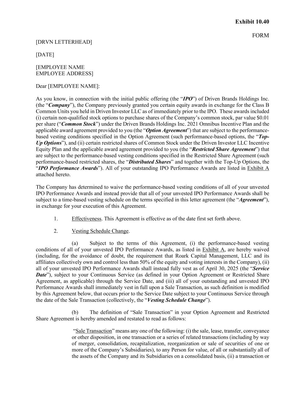 Exhibit 10.40 FORM [DRVN LETTERHEAD] [DATE] [EMPLOYEE NAME EMPLOYEE ADDRESS] Dear [EMPLOYEE NAME]: As you know, in connection with the initial public offering (the “IPO”) of Driven Brands Holdings Inc. (the “Company”), the Company previously granted you certain equity awards in exchange for the Class B Common Units you held in Driven Investor LLC as of immediately prior to the IPO. These awards included (i) certain non-qualified stock options to purchase shares of the Company’s common stock, par value $0.01 per share (“Common Stock”) under the Driven Brands Holdings Inc. 2021 Omnibus Incentive Plan and the applicable award agreement provided to you (the “Option Agreement”) that are subject to the performance- based vesting conditions specified in the Option Agreement (such performance-based options, the “Top- Up Options”), and (ii) certain restricted shares of Common Stock under the Driven Investor LLC Incentive Equity Plan and the applicable award agreement provided to you (the “Restricted Share Agreement”) that are subject to the performance-based vesting conditions specified in the Restricted Share Agreement (such performance-based restricted shares, the “Distributed Shares” and together with the Top-Up Options, the “IPO Performance Awards”). All of your outstanding IPO Performance Awards are listed in Exhibit A attached hereto. The Company has determined to waive the performance-based vesting conditions of all of your unvested IPO Performance Awards and instead provide that all of your unvested IPO Performance Awards shall be subject to a time-based vesting schedule on the terms specified in this letter agreement (the “Agreement”), in exchange for your execution of this Agreement. 1. Effectiveness. This Agreement is effective as of the date first set forth above. 2. Vesting Schedule Change. (a) Subject to the terms of this Agreement, (i) the performance-based vesting conditions of all of your unvested IPO Performance Awards, as listed in Exhibit A, are hereby waived (including, for the avoidance of doubt, the requirement that Roark Capital Management, LLC and its affiliates collectively own and control less than 50% of the equity and voting interests in the Company), (ii) all of your unvested IPO Performance Awards shall instead fully vest as of April 30, 2025 (the “Service Date”), subject to your Continuous Service (as defined in your Option Agreement or Restricted Share Agreement, as applicable) through the Service Date, and (iii) all of your outstanding and unvested IPO Performance Awards shall immediately vest in full upon a Sale Transaction, as such definition is modified by this Agreement below, that occurs prior to the Service Date subject to your Continuous Service through the date of the Sale Transaction (collectively, the “Vesting Schedule Change”). (b) The definition of “Sale Transaction” in your Option Agreement and Restricted Share Agreement is hereby amended and restated to read as follows: “Sale Transaction” means any one of the following: (i) the sale, lease, transfer, conveyance or other disposition, in one transaction or a series of related transactions (including by way of merger, consolidation, recapitalization, reorganization or sale of securities of one or more of the Company’s Subsidiaries), to any Person for value, of all or substantially all of the assets of the Company and its Subsidiaries on a consolidated basis, (ii) a transaction or