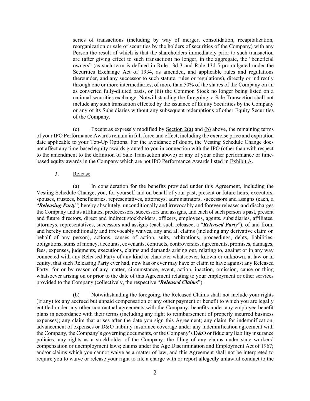 2 series of transactions (including by way of merger, consolidation, recapitalization, reorganization or sale of securities by the holders of securities of the Company) with any Person the result of which is that the shareholders immediately prior to such transaction are (after giving effect to such transaction) no longer, in the aggregate, the “beneficial owners” (as such term is defined in Rule 13d-3 and Rule 13d-5 promulgated under the Securities Exchange Act of 1934, as amended, and applicable rules and regulations thereunder, and any successor to such statute, rules or regulations), directly or indirectly through one or more intermediaries, of more than 50% of the shares of the Company on an as converted fully-diluted basis, or (iii) the Common Stock no longer being listed on a national securities exchange. Notwithstanding the foregoing, a Sale Transaction shall not include any such transaction effected by the issuance of Equity Securities by the Company or any of its Subsidiaries without any subsequent redemptions of other Equity Securities of the Company. (c) Except as expressly modified by Section 2(a) and (b) above, the remaining terms of your IPO Performance Awards remain in full force and effect, including the exercise price and expiration date applicable to your Top-Up Options. For the avoidance of doubt, the Vesting Schedule Change does not affect any time-based equity awards granted to you in connection with the IPO (other than with respect to the amendment to the definition of Sale Transaction above) or any of your other performance or time- based equity awards in the Company which are not IPO Performance Awards listed in Exhibit A. 3. Release. (a) In consideration for the benefits provided under this Agreement, including the Vesting Schedule Change, you, for yourself and on behalf of your past, present or future heirs, executors, spouses, trustees, beneficiaries, representatives, attorneys, administrators, successors and assigns (each, a “Releasing Party”) hereby absolutely, unconditionally and irrevocably and forever releases and discharges the Company and its affiliates, predecessors, successors and assigns, and each of such person’s past, present and future directors, direct and indirect stockholders, officers, employees, agents, subsidiaries, affiliates, attorneys, representatives, successors and assigns (each such releasee, a “Released Party”), of and from, and hereby unconditionally and irrevocably waives, any and all claims (including any derivative claim on behalf of any person), actions, causes of action, suits, arbitrations, proceedings, debts, liabilities, obligations, sums of money, accounts, covenants, contracts, controversies, agreements, promises, damages, fees, expenses, judgments, executions, claims and demands arising out, relating to, against or in any way connected with any Released Party of any kind or character whatsoever, known or unknown, at law or in equity, that such Releasing Party ever had, now has or ever may have or claim to have against any Released Party, for or by reason of any matter, circumstance, event, action, inaction, omission, cause or thing whatsoever arising on or prior to the date of this Agreement relating to your employment or other services provided to the Company (collectively, the respective “Released Claims”). (b) Notwithstanding the foregoing, the Released Claims shall not include your rights (if any) to: any accrued but unpaid compensation or any other payment or benefit to which you are legally entitled under any other contractual agreements with the Company; benefits under any employee benefit plans in accordance with their terms (including any right to reimbursement of properly incurred business expenses); any claim that arises after the date you sign this Agreement; any claim for indemnification, advancement of expenses or D&O liability insurance coverage under any indemnification agreement with the Company, the Company’s governing documents, or the Company’s D&O or fiduciary liability insurance policies; any rights as a stockholder of the Company; the filing of any claims under state workers’ compensation or unemployment laws; claims under the Age Discrimination and Employment Act of 1967; and/or claims which you cannot waive as a matter of law, and this Agreement shall not be interpreted to require you to waive or release your right to file a charge with or report allegedly unlawful conduct to the