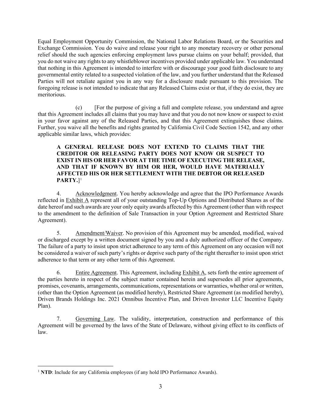 3 Equal Employment Opportunity Commission, the National Labor Relations Board, or the Securities and Exchange Commission. You do waive and release your right to any monetary recovery or other personal relief should the such agencies enforcing employment laws pursue claims on your behalf; provided, that you do not waive any rights to any whistleblower incentives provided under applicable law. You understand that nothing in this Agreement is intended to interfere with or discourage your good faith disclosure to any governmental entity related to a suspected violation of the law, and you further understand that the Released Parties will not retaliate against you in any way for a disclosure made pursuant to this provision. The foregoing release is not intended to indicate that any Released Claims exist or that, if they do exist, they are meritorious. (c) [For the purpose of giving a full and complete release, you understand and agree that this Agreement includes all claims that you may have and that you do not now know or suspect to exist in your favor against any of the Released Parties, and that this Agreement extinguishes those claims. Further, you waive all the benefits and rights granted by California Civil Code Section 1542, and any other applicable similar laws, which provides: A GENERAL RELEASE DOES NOT EXTEND TO CLAIMS THAT THE CREDITOR OR RELEASING PARTY DOES NOT KNOW OR SUSPECT TO EXIST IN HIS OR HER FAVOR AT THE TIME OF EXECUTING THE RELEASE, AND THAT IF KNOWN BY HIM OR HER, WOULD HAVE MATERIALLY AFFECTED HIS OR HER SETTLEMENT WITH THE DEBTOR OR RELEASED PARTY.]1 4. Acknowledgment. You hereby acknowledge and agree that the IPO Performance Awards reflected in Exhibit A represent all of your outstanding Top-Up Options and Distributed Shares as of the date hereof and such awards are your only equity awards affected by this Agreement (other than with respect to the amendment to the definition of Sale Transaction in your Option Agreement and Restricted Share Agreement). 5. Amendment/Waiver. No provision of this Agreement may be amended, modified, waived or discharged except by a written document signed by you and a duly authorized officer of the Company. The failure of a party to insist upon strict adherence to any term of this Agreement on any occasion will not be considered a waiver of such party’s rights or deprive such party of the right thereafter to insist upon strict adherence to that term or any other term of this Agreement. 6. Entire Agreement. This Agreement, including Exhibit A, sets forth the entire agreement of the parties hereto in respect of the subject matter contained herein and supersedes all prior agreements, promises, covenants, arrangements, communications, representations or warranties, whether oral or written, (other than the Option Agreement (as modified hereby), Restricted Share Agreement (as modified hereby), Driven Brands Holdings Inc. 2021 Omnibus Incentive Plan, and Driven Investor LLC Incentive Equity Plan). 7. Governing Law. The validity, interpretation, construction and performance of this Agreement will be governed by the laws of the State of Delaware, without giving effect to its conflicts of law. 1 NTD: Include for any California employees (if any hold IPO Performance Awards).