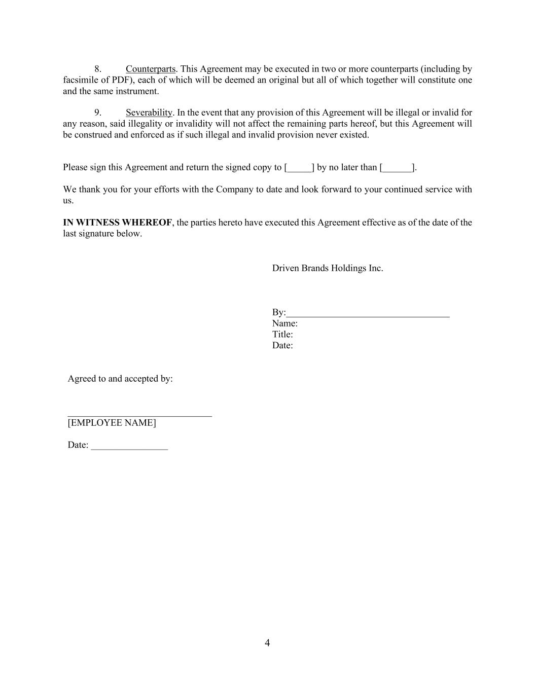 4 8. Counterparts. This Agreement may be executed in two or more counterparts (including by facsimile of PDF), each of which will be deemed an original but all of which together will constitute one and the same instrument. 9. Severability. In the event that any provision of this Agreement will be illegal or invalid for any reason, said illegality or invalidity will not affect the remaining parts hereof, but this Agreement will be construed and enforced as if such illegal and invalid provision never existed. Please sign this Agreement and return the signed copy to [_____] by no later than [______]. We thank you for your efforts with the Company to date and look forward to your continued service with us. IN WITNESS WHEREOF, the parties hereto have executed this Agreement effective as of the date of the last signature below. Driven Brands Holdings Inc. By:__________________________________ Name: Title: Date: Agreed to and accepted by: ______________________________ [EMPLOYEE NAME] Date: ________________