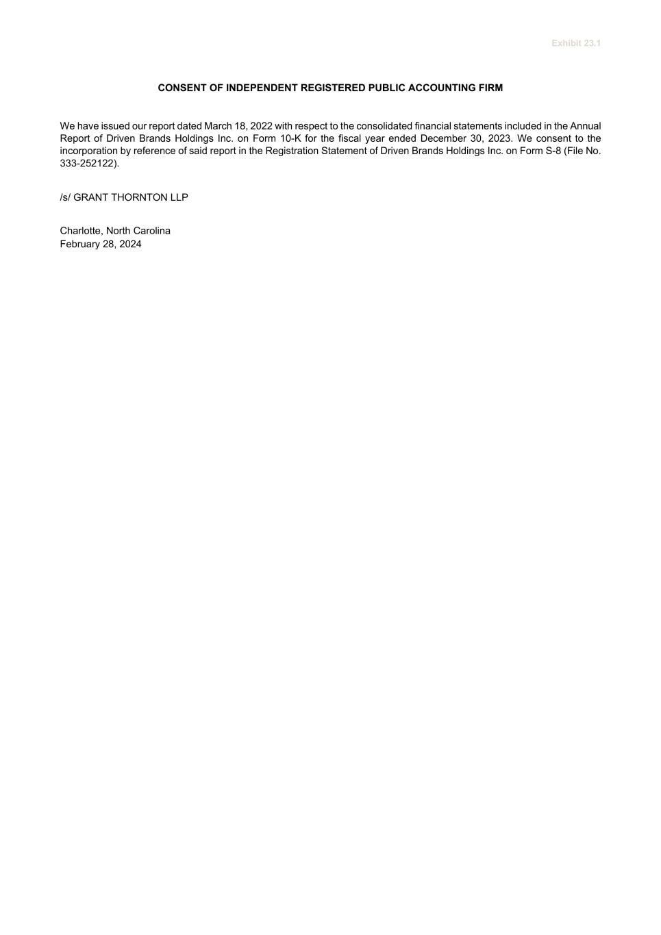 Exhibit 23.1 CONSENT OF INDEPENDENT REGISTERED PUBLIC ACCOUNTING FIRM We have issued our report dated March 18, 2022 with respect to the consolidated financial statements included in the Annual Report of Driven Brands Holdings Inc. on Form 10-K for the fiscal year ended December 30, 2023. We consent to the incorporation by reference of said report in the Registration Statement of Driven Brands Holdings Inc. on Form S-8 (File No. 333-252122). /s/ GRANT THORNTON LLP Charlotte, North Carolina February 28, 2024