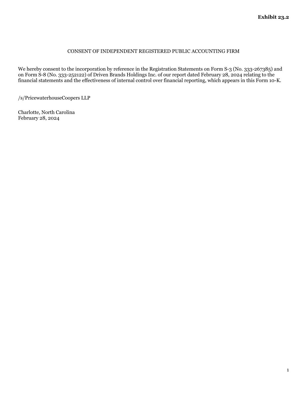 Exhibit 23.2 1 CONSENT OF INDEPENDENT REGISTERED PUBLIC ACCOUNTING FIRM We hereby consent to the incorporation by reference in the Registration Statements on Form S-3 (No. 333-267385) and on Form S-8 (No. 333-252122) of Driven Brands Holdings Inc. of our report dated February 28, 2024 relating to the financial statements and the effectiveness of internal control over financial reporting, which appears in this Form 10-K. /s/PricewaterhouseCoopers LLP Charlotte, North Carolina February 28, 2024
