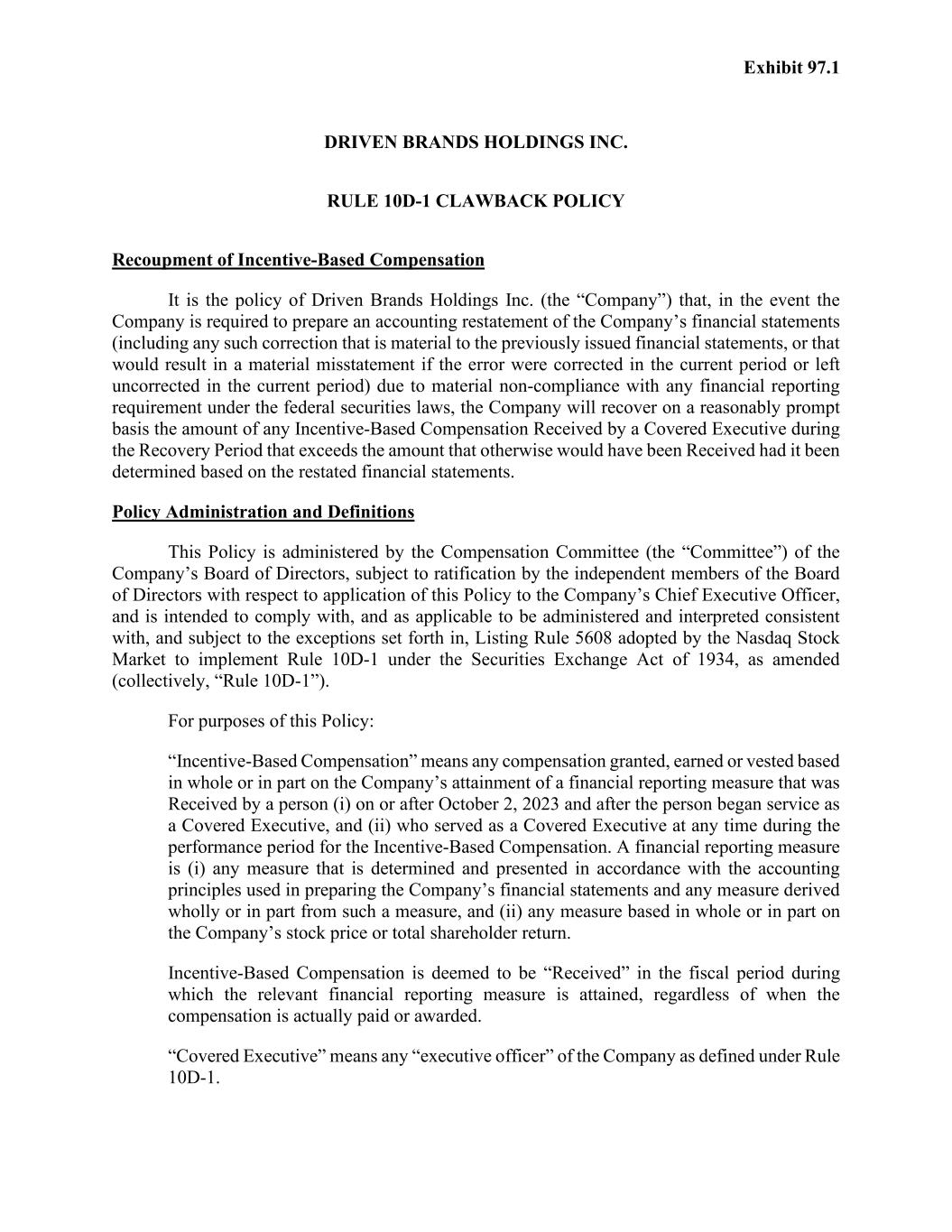 Exhibit 97.1 DRIVEN BRANDS HOLDINGS INC. RULE 10D-1 CLAWBACK POLICY Recoupment of Incentive-Based Compensation It is the policy of Driven Brands Holdings Inc. (the “Company”) that, in the event the Company is required to prepare an accounting restatement of the Company’s financial statements (including any such correction that is material to the previously issued financial statements, or that would result in a material misstatement if the error were corrected in the current period or left uncorrected in the current period) due to material non-compliance with any financial reporting requirement under the federal securities laws, the Company will recover on a reasonably prompt basis the amount of any Incentive-Based Compensation Received by a Covered Executive during the Recovery Period that exceeds the amount that otherwise would have been Received had it been determined based on the restated financial statements. Policy Administration and Definitions This Policy is administered by the Compensation Committee (the “Committee”) of the Company’s Board of Directors, subject to ratification by the independent members of the Board of Directors with respect to application of this Policy to the Company’s Chief Executive Officer, and is intended to comply with, and as applicable to be administered and interpreted consistent with, and subject to the exceptions set forth in, Listing Rule 5608 adopted by the Nasdaq Stock Market to implement Rule 10D-1 under the Securities Exchange Act of 1934, as amended (collectively, “Rule 10D-1”). For purposes of this Policy: “Incentive-Based Compensation” means any compensation granted, earned or vested based in whole or in part on the Company’s attainment of a financial reporting measure that was Received by a person (i) on or after October 2, 2023 and after the person began service as a Covered Executive, and (ii) who served as a Covered Executive at any time during the performance period for the Incentive-Based Compensation. A financial reporting measure is (i) any measure that is determined and presented in accordance with the accounting principles used in preparing the Company’s financial statements and any measure derived wholly or in part from such a measure, and (ii) any measure based in whole or in part on the Company’s stock price or total shareholder return. Incentive-Based Compensation is deemed to be “Received” in the fiscal period during which the relevant financial reporting measure is attained, regardless of when the compensation is actually paid or awarded. “Covered Executive” means any “executive officer” of the Company as defined under Rule 10D-1.