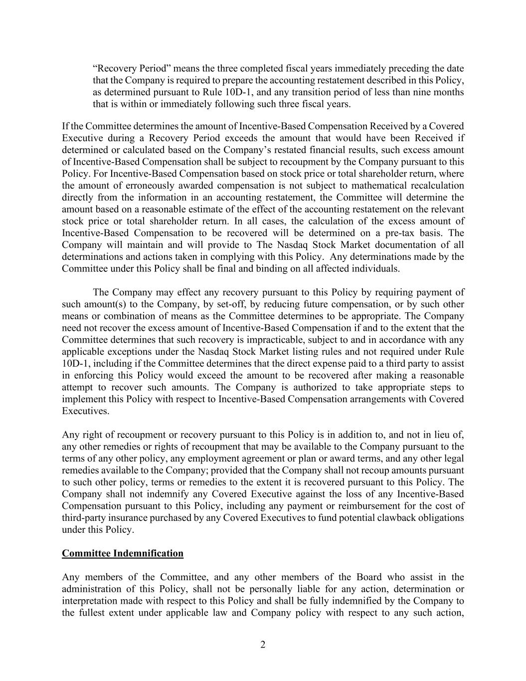 2 “Recovery Period” means the three completed fiscal years immediately preceding the date that the Company is required to prepare the accounting restatement described in this Policy, as determined pursuant to Rule 10D-1, and any transition period of less than nine months that is within or immediately following such three fiscal years. If the Committee determines the amount of Incentive-Based Compensation Received by a Covered Executive during a Recovery Period exceeds the amount that would have been Received if determined or calculated based on the Company’s restated financial results, such excess amount of Incentive-Based Compensation shall be subject to recoupment by the Company pursuant to this Policy. For Incentive-Based Compensation based on stock price or total shareholder return, where the amount of erroneously awarded compensation is not subject to mathematical recalculation directly from the information in an accounting restatement, the Committee will determine the amount based on a reasonable estimate of the effect of the accounting restatement on the relevant stock price or total shareholder return. In all cases, the calculation of the excess amount of Incentive-Based Compensation to be recovered will be determined on a pre-tax basis. The Company will maintain and will provide to The Nasdaq Stock Market documentation of all determinations and actions taken in complying with this Policy. Any determinations made by the Committee under this Policy shall be final and binding on all affected individuals. The Company may effect any recovery pursuant to this Policy by requiring payment of such amount(s) to the Company, by set-off, by reducing future compensation, or by such other means or combination of means as the Committee determines to be appropriate. The Company need not recover the excess amount of Incentive-Based Compensation if and to the extent that the Committee determines that such recovery is impracticable, subject to and in accordance with any applicable exceptions under the Nasdaq Stock Market listing rules and not required under Rule 10D-1, including if the Committee determines that the direct expense paid to a third party to assist in enforcing this Policy would exceed the amount to be recovered after making a reasonable attempt to recover such amounts. The Company is authorized to take appropriate steps to implement this Policy with respect to Incentive-Based Compensation arrangements with Covered Executives. Any right of recoupment or recovery pursuant to this Policy is in addition to, and not in lieu of, any other remedies or rights of recoupment that may be available to the Company pursuant to the terms of any other policy, any employment agreement or plan or award terms, and any other legal remedies available to the Company; provided that the Company shall not recoup amounts pursuant to such other policy, terms or remedies to the extent it is recovered pursuant to this Policy. The Company shall not indemnify any Covered Executive against the loss of any Incentive-Based Compensation pursuant to this Policy, including any payment or reimbursement for the cost of third-party insurance purchased by any Covered Executives to fund potential clawback obligations under this Policy. Committee Indemnification Any members of the Committee, and any other members of the Board who assist in the administration of this Policy, shall not be personally liable for any action, determination or interpretation made with respect to this Policy and shall be fully indemnified by the Company to the fullest extent under applicable law and Company policy with respect to any such action,