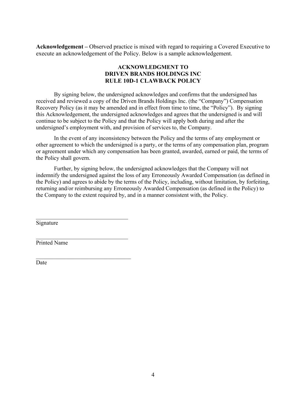 4 Acknowledgement – Observed practice is mixed with regard to requiring a Covered Executive to execute an acknowledgement of the Policy. Below is a sample acknowledgement. ACKNOWLEDGMENT TO DRIVEN BRANDS HOLDINGS INC RULE 10D-1 CLAWBACK POLICY By signing below, the undersigned acknowledges and confirms that the undersigned has received and reviewed a copy of the Driven Brands Holdings Inc. (the “Company”) Compensation Recovery Policy (as it may be amended and in effect from time to time, the “Policy”). By signing this Acknowledgement, the undersigned acknowledges and agrees that the undersigned is and will continue to be subject to the Policy and that the Policy will apply both during and after the undersigned’s employment with, and provision of services to, the Company. In the event of any inconsistency between the Policy and the terms of any employment or other agreement to which the undersigned is a party, or the terms of any compensation plan, program or agreement under which any compensation has been granted, awarded, earned or paid, the terms of the Policy shall govern. Further, by signing below, the undersigned acknowledges that the Company will not indemnify the undersigned against the loss of any Erroneously Awarded Compensation (as defined in the Policy) and agrees to abide by the terms of the Policy, including, without limitation, by forfeiting, returning and/or reimbursing any Erroneously Awarded Compensation (as defined in the Policy) to the Company to the extent required by, and in a manner consistent with, the Policy. ________________________________ Signature ________________________________ Printed Name _________________________________ Date