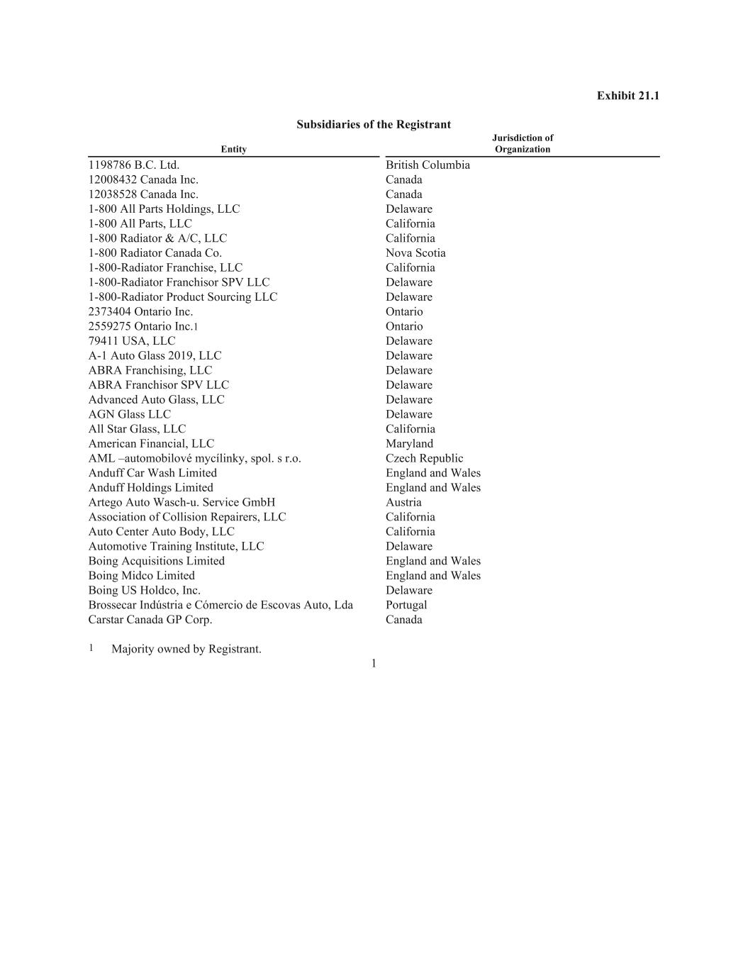 Exhibit 21.1 Subsidiaries of the Registrant Entity Jurisdiction of Organization 1198786 B.C. Ltd. British Columbia 12008432 Canada Inc. Canada 12038528 Canada Inc. Canada 1-800 All Parts Holdings, LLC Delaware 1-800 All Parts, LLC California 1-800 Radiator & A/C, LLC California 1-800 Radiator Canada Co. Nova Scotia 1-800-Radiator Franchise, LLC California 1-800-Radiator Franchisor SPV LLC Delaware 1-800-Radiator Product Sourcing LLC Delaware 2373404 Ontario Inc. Ontario 2559275 Ontario Inc.1 Ontario 79411 USA, LLC Delaware A-1 Auto Glass 2019, LLC Delaware ABRA Franchising, LLC Delaware ABRA Franchisor SPV LLC Delaware Advanced Auto Glass, LLC Delaware AGN Glass LLC Delaware All Star Glass, LLC California American Financial, LLC Maryland AML –automobilové mycílinky, spol. s r.o. Czech Republic Anduff Car Wash Limited England and Wales Anduff Holdings Limited England and Wales Artego Auto Wasch-u. Service GmbH Austria Association of Collision Repairers, LLC California Auto Center Auto Body, LLC California Automotive Training Institute, LLC Delaware Boing Acquisitions Limited England and Wales Boing Midco Limited England and Wales Boing US Holdco, Inc. Delaware Brossecar Indústria e Cómercio de Escovas Auto, Lda Portugal Carstar Canada GP Corp. Canada 1 Majority owned by Registrant. 1