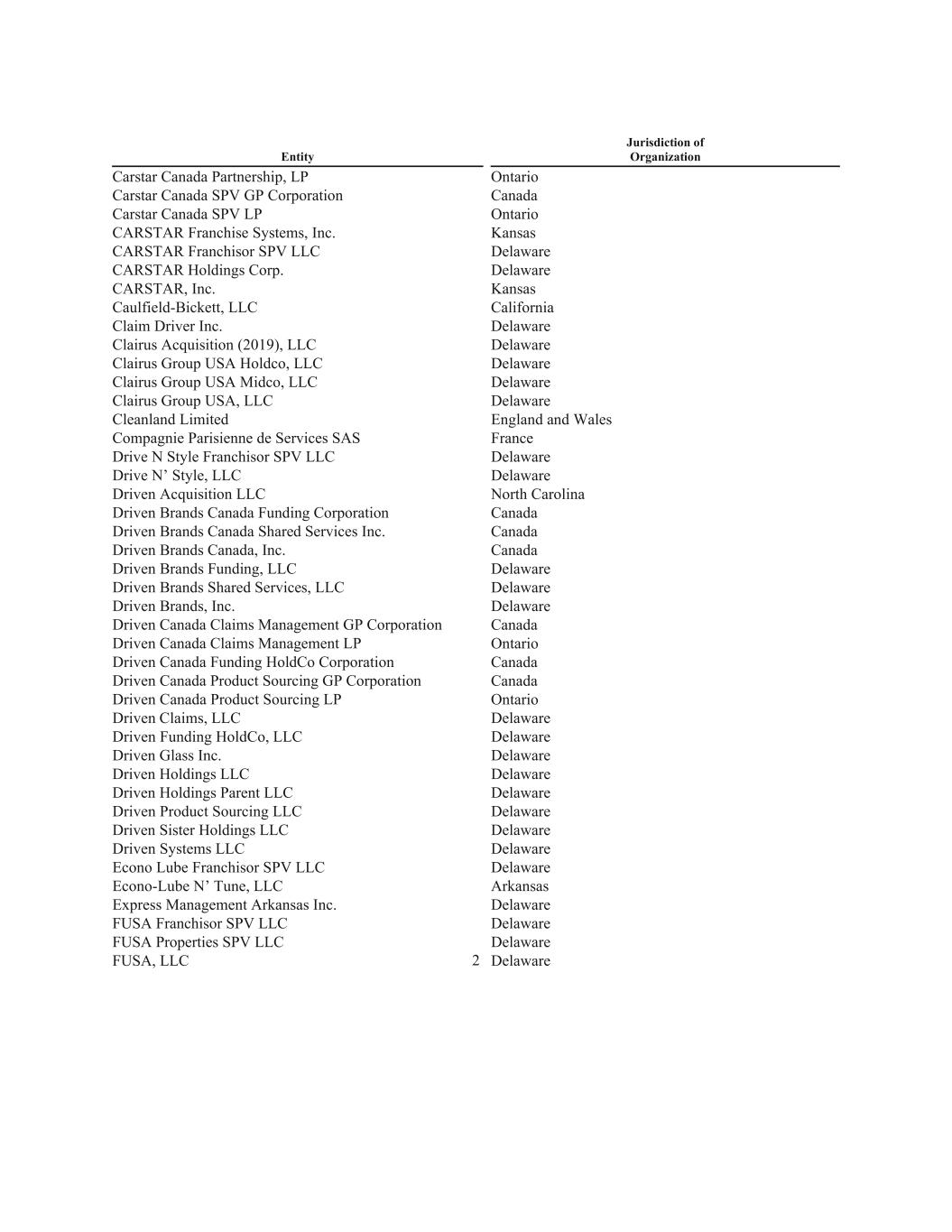 Entity Jurisdiction of Organization Ontario Canada Ontario Kansas Delaware Delaware Kansas California Delaware Delaware Delaware Delaware Delaware England and Wales France Delaware Delaware North Carolina Canada Canada Canada Delaware Delaware Delaware Canada Ontario Canada Canada Ontario Carstar Canada Partnership, LP Carstar Canada SPV GP Corporation Carstar Canada SPV LP CARSTAR Franchise Systems, Inc. CARSTAR Franchisor SPV LLC CARSTAR Holdings Corp. CARSTAR, Inc. Caulfield-Bickett, LLC Claim Driver Inc. Clairus Acquisition (2019), LLC Clairus Group USA Holdco, LLC Clairus Group USA Midco, LLC Clairus Group USA, LLC Cleanland Limited Compagnie Parisienne de Services SAS Drive N Style Franchisor SPV LLC Drive N’ Style, LLC Driven Acquisition LLC Driven Brands Canada Funding Corporation Driven Brands Canada Shared Services Inc. Driven Brands Canada, Inc. Driven Brands Funding, LLC Driven Brands Shared Services, LLC Driven Brands, Inc. Driven Canada Claims Management GP Corporation Driven Canada Claims Management LP Driven Canada Funding HoldCo Corporation Driven Canada Product Sourcing GP Corporation Driven Canada Product Sourcing LP Driven Claims, LLC Driven Funding HoldCo, LLC Driven Glass Inc. Driven Holdings LLC Driven Holdings Parent LLC Driven Product Sourcing LLC Driven Sister Holdings LLC Driven Systems LLC Econo Lube Franchisor SPV LLC Econo-Lube N’ Tune, LLC Express Management Arkansas Inc. FUSA Franchisor SPV LLC FUSA Properties SPV LLC FUSA, LLC Delaware Delaware Delaware Delaware Delaware Delaware Delaware Delaware Delaware Arkansas Delaware Delaware Delaware Delaware 2