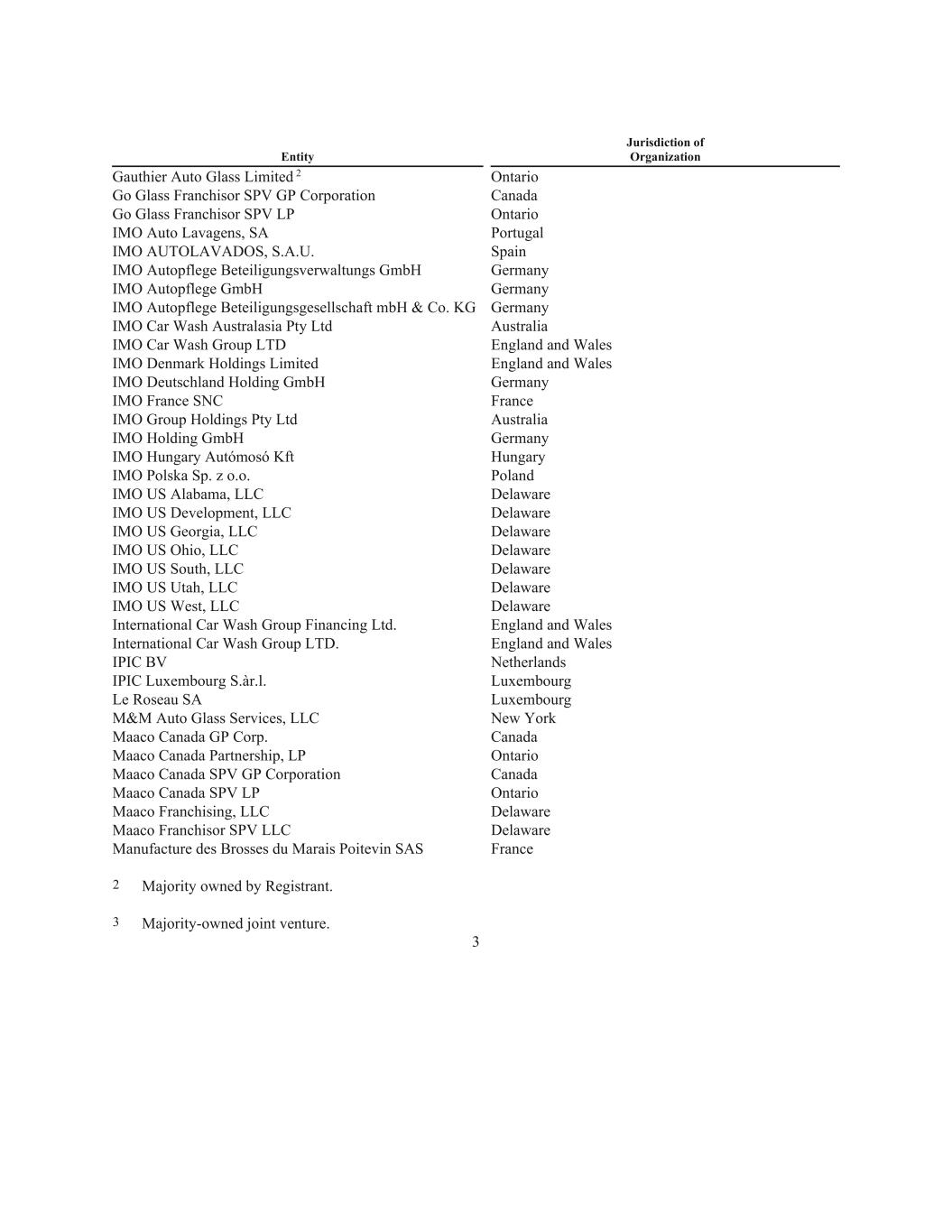 Entity Jurisdiction of Organization Gauthier Auto Glass Limited 2 Ontario Go Glass Franchisor SPV GP Corporation Canada Go Glass Franchisor SPV LP Ontario IMO Auto Lavagens, SA Portugal IMO AUTOLAVADOS, S.A.U. Spain IMO Autopflege Beteiligungsverwaltungs GmbH Germany IMO Autopflege GmbH Germany IMO Autopflege Beteiligungsgesellschaft mbH & Co. KG Germany IMO Car Wash Australasia Pty Ltd Australia IMO Car Wash Group LTD England and Wales IMO Denmark Holdings Limited England and Wales IMO Deutschland Holding GmbH Germany IMO France SNC France IMO Group Holdings Pty Ltd Australia IMO Holding GmbH Germany IMO Hungary Autómosó Kft Hungary IMO Polska Sp. z o.o. Poland IMO US Alabama, LLC Delaware IMO US Development, LLC Delaware IMO US Georgia, LLC Delaware IMO US Ohio, LLC Delaware IMO US South, LLC Delaware IMO US Utah, LLC Delaware IMO US West, LLC Delaware International Car Wash Group Financing Ltd. England and Wales International Car Wash Group LTD. England and Wales IPIC BV Netherlands IPIC Luxembourg S.àr.l. Luxembourg Le Roseau SA Luxembourg M&M Auto Glass Services, LLC New York Maaco Canada GP Corp. Canada Maaco Canada Partnership, LP Ontario Maaco Canada SPV GP Corporation Canada Maaco Canada SPV LP Ontario Maaco Franchising, LLC Delaware Maaco Franchisor SPV LLC Delaware Manufacture des Brosses du Marais Poitevin SAS France 2 Majority owned by Registrant. 3 Majority-owned joint venture. 3