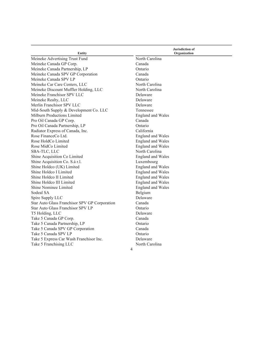 Entity Jurisdiction of Organization Meineke Advertising Trust Fund North Carolina Meineke Canada GP Corp. Canada Meineke Canada Partnership, LP Ontario Meineke Canada SPV GP Corporation Canada Meineke Canada SPV LP Ontario Meineke Car Care Centers, LLC North Carolina Meineke Discount Muffler Holding, LLC North Carolina Meineke Franchisor SPV LLC Delaware Meineke Realty, LLC Delaware Merlin Franchisor SPV LLC Delaware Mid-South Supply & Development Co. LLC Tennessee Milburn Productions Limited England and Wales Pro Oil Canada GP Corp. Canada Pro Oil Canada Partnership, LP Ontario Radiator Express of Canada, Inc. California Rose FinanceCo Ltd. England and Wales Rose HoldCo Limited England and Wales Rose MidCo Limited England and Wales SBA-TLC, LLC North Carolina Shine Acquisition Co Limited England and Wales Shine Acquisition Co. S.à r.l. Luxembourg Shine Holdco (UK) Limited England and Wales Shine Holdco I Limited England and Wales Shine Holdco II Limited England and Wales Shine Holdco III Limited England and Wales Shine Nominee Limited England and Wales Sodeal SA Belgium Spire Supply LLC Delaware Star Auto Glass Franchisor SPV GP Corporation Canada Star Auto Glass Franchisor SPV LP Ontario T5 Holding, LLC Delaware Take 5 Canada GP Corp. Canada Take 5 Canada Partnership, LP Ontario Take 5 Canada SPV GP Corporation Canada Take 5 Canada SPV LP Ontario Take 5 Express Car Wash Franchisor Inc. Delaware Take 5 Franchising LLC North Carolina 4
