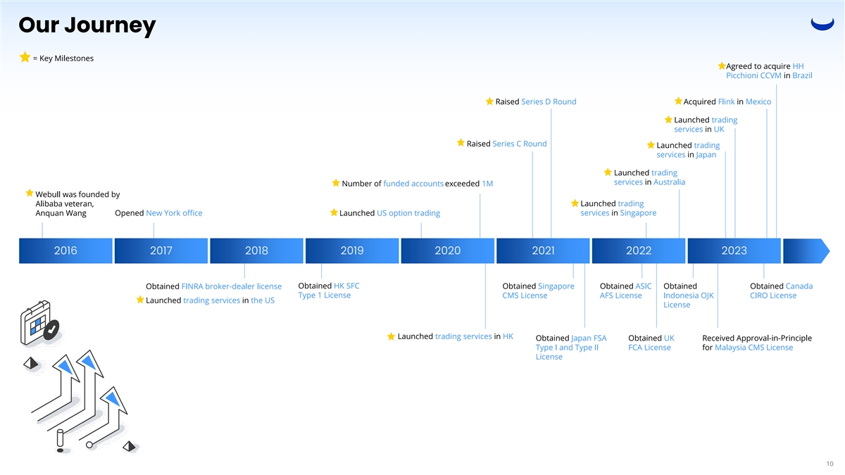 Our Journey = Key Milestones Agreed to acquire HH Picchioni CCVM in Brazil Raised Series D Round Acquired Flink in Mexico Launched trading services in UK Raised Series C Round Launched trading services in Japan Launched trading services in Australia Number of funded accounts exceeded 1M Webull was founded by Alibaba veteran, Launched trading Anquan Wang Opened New York office Launched US option trading services in Singapore 2016 2017 2018 2019 2020 2021 2022 2023 Obtained HK SFC Obtained Singapore Obtained ASIC Obtained Obtained Canada Obtained FINRA broker-dealer license Type 1 License CMS License AFS License Indonesia OJK CIRO License Launched trading services in the US License Launched trading services in HK Obtained Japan FSA Obtained UK Received Approval-in-Principle Type I and Type II FCA License for Malaysia CMS License License 10