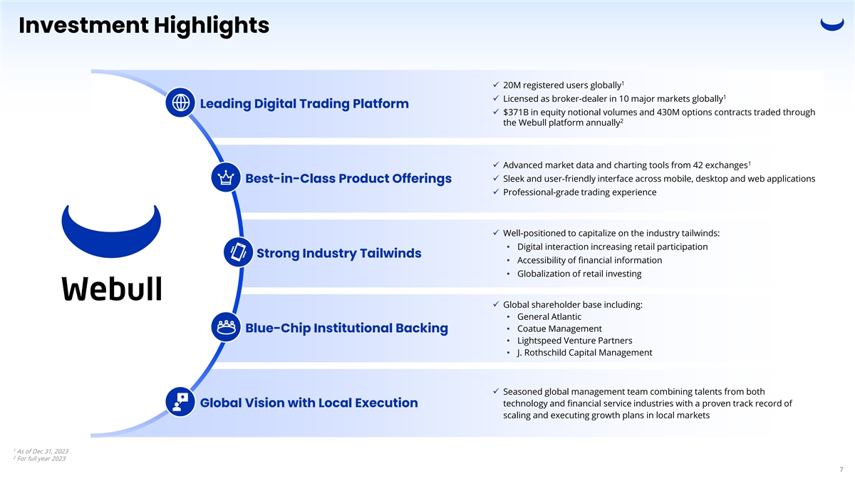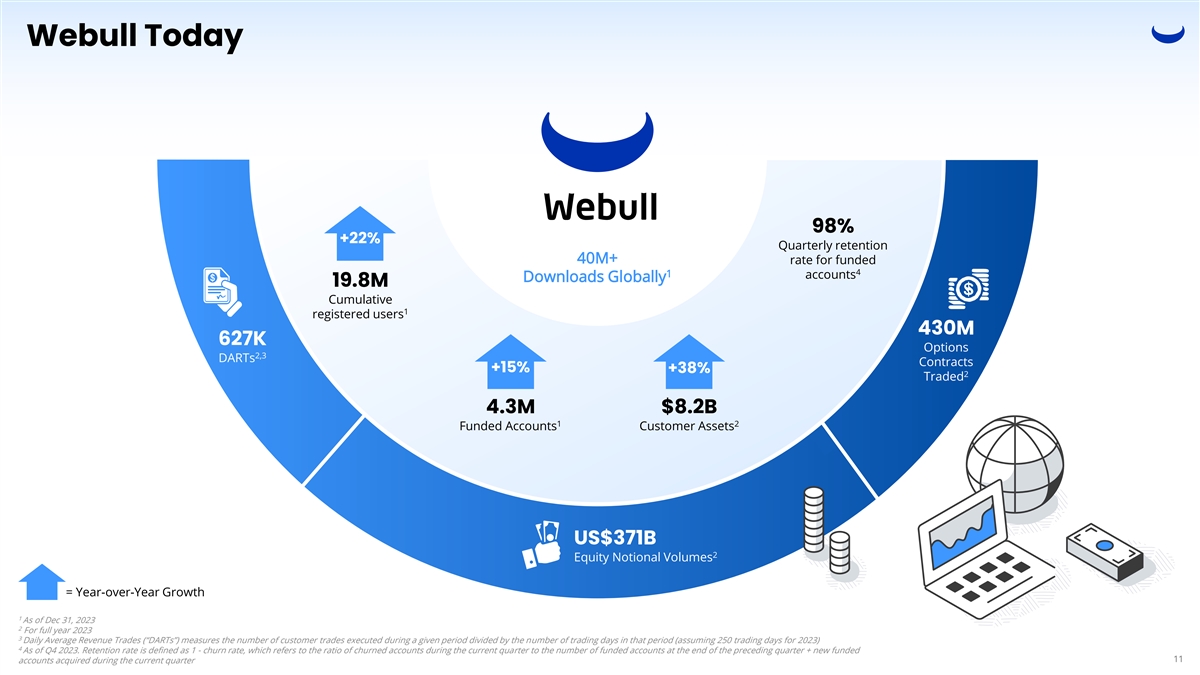 | | Leading Digital Trading Platform: Licensed as broker-dealer in 10 major markets and operates in 15 regions globally with approximately $370 billion in equity notional volumes and 430 million options contracts traded through Webull platform in 2023. |