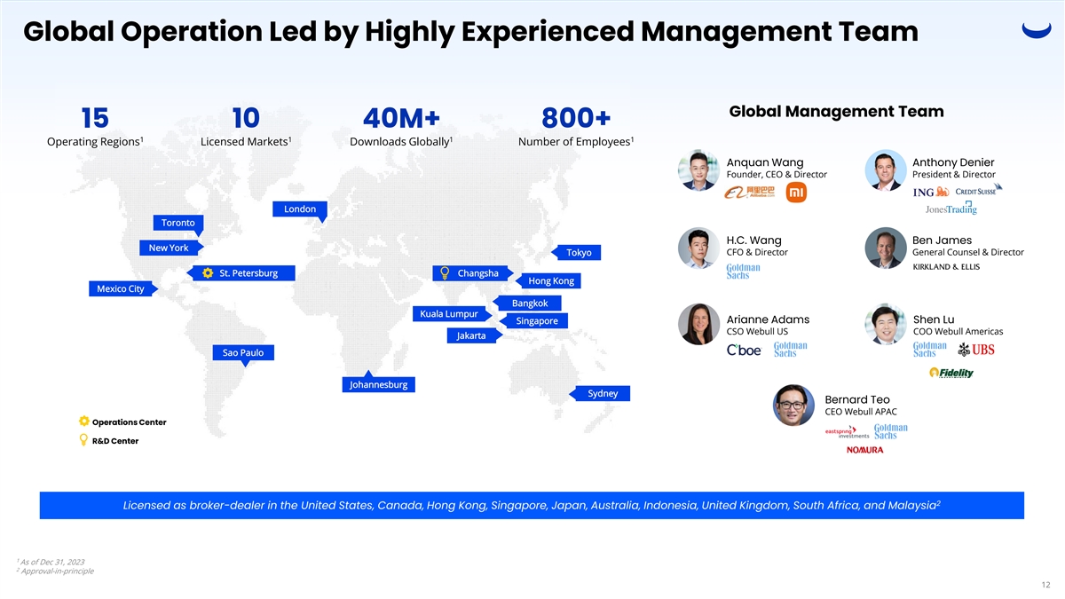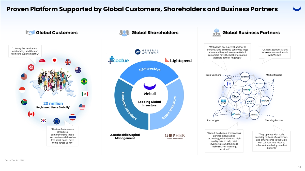 Global Operation Led by Highly Experienced Management Team Global Management Team 15 10 40M+ 800+ 1 1 1 1 Operating Regions Licensed Markets Downloads Globally Number of Employees Anquan Wang Anthony Denier Founder, CEO & Director President & Director London Toronto H.C. Wang Ben James New York Tokyo CFO & Director General Counsel & Director St. Petersburg Changsha Hong Kong Mexico City Bangkok Kuala Lumpur Arianne Adams Shen Lu Singapore CSO Webull US COO Webull Americas Jakarta Sao Paulo Johannesburg Sydney Bernard Teo CEO Webull APAC Operations Center R&D Center 2 Licensed as broker-dealer in the United States, Canada, Hong Kong, Singapore, Japan, Australia, Indonesia, United Kingdom, South Africa, and Malaysia 1 As of Dec 31, 2023 2 Approval-in-principle 12
