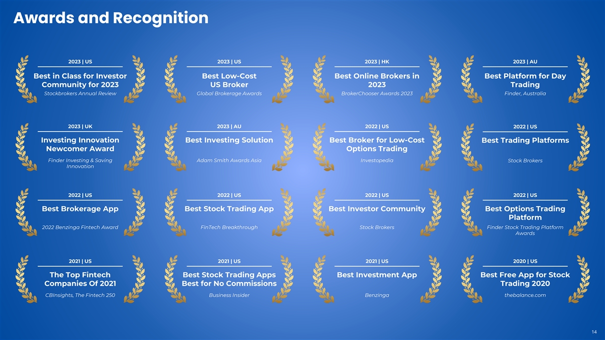 Awards and Recognition 2023 | US 2023 | US 2023 | HK 2023 | AU Best in Class for Investor Best Low-Cost Best Online Brokers in Best Platform for Day Community for 2023 US Broker 2023 Trading Stockbrokers Annual Review Global Brokerage Awards BrokerChooser Awards 2023 Finder, Australia 2023 | UK 2023 | AU 2022 | US 2022 | US Investing Innovation Best Investing Solution Best Broker for Low-Cost Best Trading Platforms Newcomer Award Options Trading Finder Investing & Saving Adam Smith Awards Asia Investopedia Stock Brokers Innovation 2022 | US 2022 | US 2022 | US 2022 | US Best Brokerage App Best Stock Trading App Best Investor Community Best Options Trading Platform 2022 Benzinga Fintech Award FinTech Breakthrough Stock Brokers Finder Stock Trading Platform Awards 2021 | US 2021 | US 2021 | US 2020 | US The Top Fintech Best Stock Trading Apps Best Investment App Best Free App for Stock Companies Of 2021 Best for No Commissions Trading 2020 CBInsights, The Fintech 250 Business Insider Benzinga thebalance.com 14