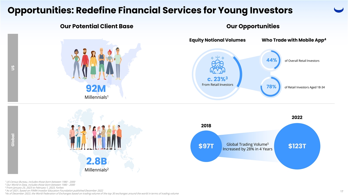 Opportunities: Redefine Financial Services for Young Investors Our Potential Client Base Our Opportunities 4 Equity Notional Volumes Who Trade with Mobile App 44% of Overall Retail Investors 3 c. 23% From Retail Investors 78% of Retail Investors Aged 18-34 92M 1 Millennials 2022 2018 5 Global Trading Volume $97T $123T Increased by 28% in 4 Years 2.8B 2 Millennials 1 US Census Bureau, includes those born between 1980 - 2000 2 Our World in Data, includes those born between 1980 - 2000 3 From January 25, 2023 to February 1, 2023, Forbes 4 As of 2021, based on FINRA Investor Education Foundation published December 2022 17 5 As of December 2023, the World Federation of Exchanges based on trading volume of the top 30 exchanges around the world in terms of trading volume Global US
