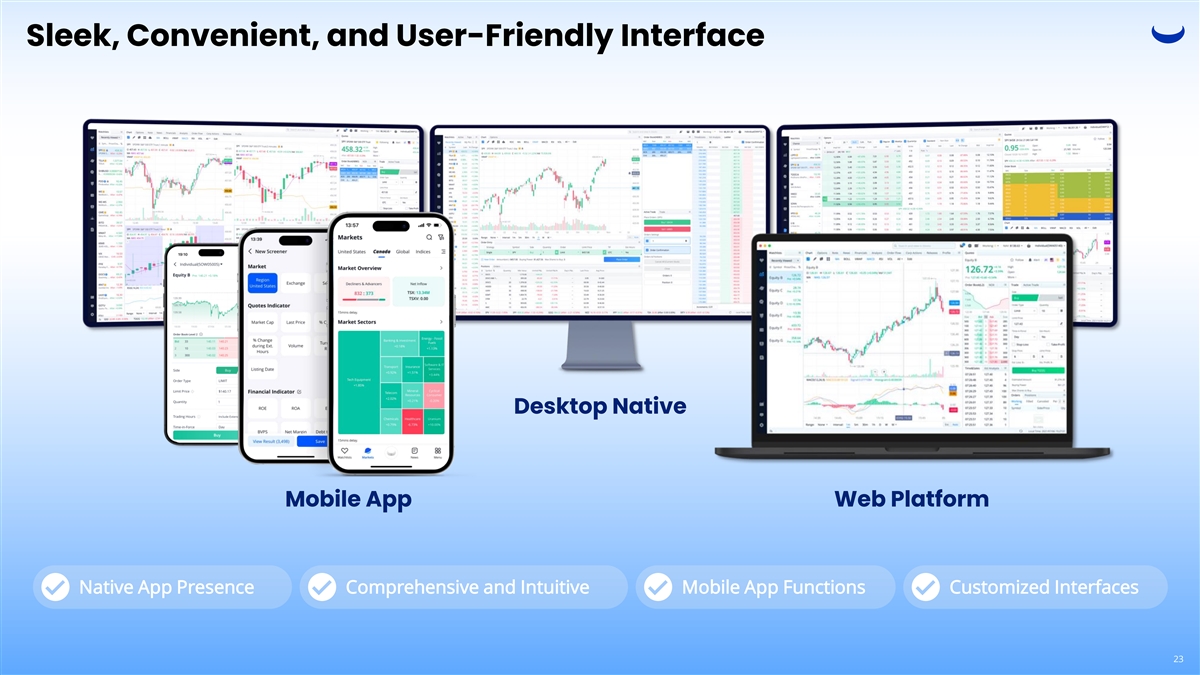 Sleek, Convenient, and User-Friendly Interface Desktop Native Mobile App Web Platform Native App Presence Comprehensive and Intuitive Mobile App Functions Customized Interfaces 23