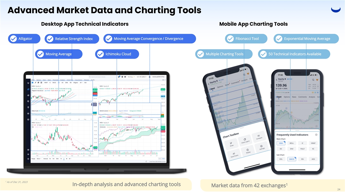 Advanced Market Data and Charting Tools Desktop App Technical Indicators Mobile App Charting Tools Alligator Relative Strength Index Moving Average Convergence / Divergence Fibonacci Tool Exponential Moving Average Moving Average Ichimoku Cloud Multiple Charting Tools 50 Technical Indicators Available e 1 As of Dec 31, 2023 1 In-depth analysis and advanced charting tools Market data from 42 exchanges 24
