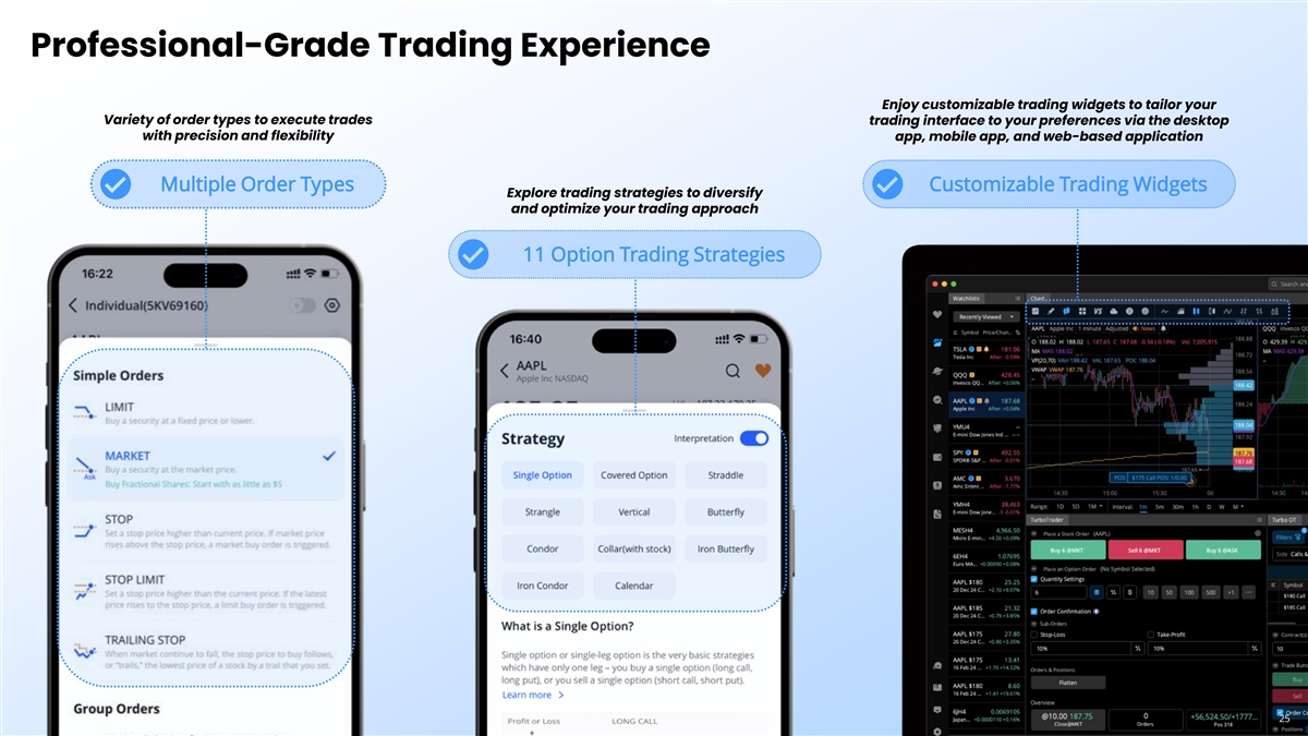 Professional-Grade Trading Experience Enjoy customizable trading widgets to tailor your Variety of order types to execute trades trading interface to your preferences via the desktop with precision and flexibility app, mobile app, and web-based application Multiple Order Types Customizable Trading Widgets Explore trading strategies to diversify and optimize your trading approach 11 Option Trading Strategies 25
