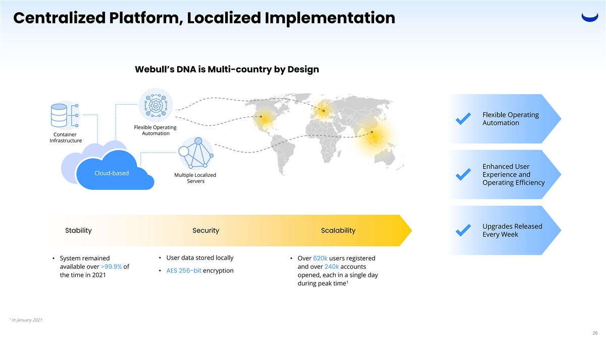 Centralized Platform, Localized Implementation Webull’s DNA is Multi-country by Design Flexible Operating Automation Flexible Operating Automation Container Infrastructure Enhanced User Cloud-based Multiple Localized Experience and Servers Operating Efficiency Upgrades Released Stability Security Scalability Every Week • System remained • User data stored locally• Over 620k users registered available over >99.9% of and over 240k accounts • AES 256-bit encryption the time in 2021 opened, each in a single day 1 during peak time 1 In January 2021 26