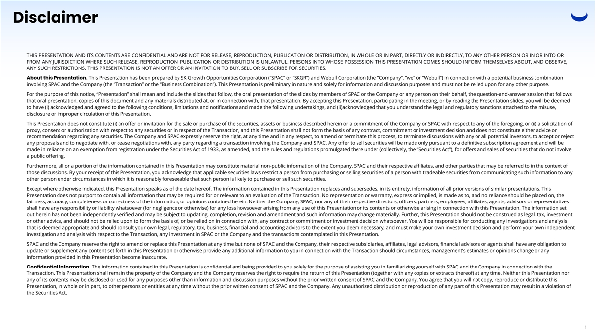 Disclaimer THIS PRESENTATION AND ITS CONTENTS ARE CONFIDENTIAL AND ARE NOT FOR RELEASE, REPRODUCTION, PUBLICATION OR DISTRIBUTION, IN WHOLE OR IN PART, DIRECTLY OR INDIRECTLY, TO ANY OTHER PERSON OR IN OR INTO OR FROM ANY JURISDICTION WHERE SUCH RELEASE, REPRODUCTION, PUBLICATION OR DISTRIBUTION IS UNLAWFUL. PERSONS INTO WHOSE POSSESSION THIS PRESENTATION COMES SHOULD INFORM THEMSELVES ABOUT, AND OBSERVE, ANY SUCH RESTRICTIONS. THIS PRESENTATION IS NOT AN OFFER OR AN INVITATION TO BUY, SELL OR SUBSCRIBE FOR SECURITIES. About this Presentation. This Presentation has been prepared by SK Growth Opportunities Corporation (“SPAC” or “SKGR”) and Webull Corporation (the “Company”, “we” or “Webull”) in connection with a potential business combination involving SPAC and the Company (the “Transaction” or the “Business Combination”). This Presentation is preliminary in nature and solely for information and discussion purposes and must not be relied upon for any other purpose. For the purpose of this notice, “Presentation” shall mean and include the slides that follow, the oral presentation of the slides by members of SPAC or the Company or any person on their behalf, the question-and-answer session that follows that oral presentation, copies of this document and any materials distributed at, or in connection with, that presentation. By accepting this Presentation, participating in the meeting, or by reading the Presentation slides, you will be deemed to have (i) acknowledged and agreed to the following conditions, limitations and notifications and made the following undertakings, and (ii)acknowledged that you understand the legal and regulatory sanctions attached to the misuse, disclosure or improper circulation of this Presentation. This Presentation does not constitute (i) an offer or invitation for the sale or purchase of the securities, assets or business described herein or a commitment of the Company or SPAC with respect to any of the foregoing, or (ii) a solicitation of proxy, consent or authorization with respect to any securities or in respect of the Transaction, and this Presentation shall not form the basis of any contract, commitment or investment decision and does not constitute either advice or recommendation regarding any securities. The Company and SPAC expressly reserve the right, at any time and in any respect, to amend or terminate this process, to terminate discussions with any or all potential investors, to accept or reject any proposals and to negotiate with, or cease negotiations with, any party regarding a transaction involving the Company and SPAC. Any offer to sell securities will be made only pursuant to a definitive subscription agreement and will be made in reliance on an exemption from registration under the Securities Act of 1933, as amended, and the rules and regulations promulgated there under (collectively, the “Securities Act”), for offers and sales of securities that do not involve a public offering. Furthermore, all or a portion of the information contained in this Presentation may constitute material non-public information of the Company, SPAC and their respective affiliates, and other parties that may be referred to in the context of those discussions. By your receipt of this Presentation, you acknowledge that applicable securities laws restrict a person from purchasing or selling securities of a person with tradeable securities from communicating such information to any other person under circumstances in which it is reasonably foreseeable that such person is likely to purchase or sell such securities. Except where otherwise indicated, this Presentation speaks as of the date hereof. The information contained in this Presentation replaces and supersedes, in its entirety, information of all prior versions of similar presentations. This Presentation does not purport to contain all information that may be required for or relevant to an evaluation of the Transaction. No representation or warranty, express or implied, is made as to, and no reliance should be placed on, the fairness, accuracy, completeness or correctness of the information, or opinions contained herein. Neither the Company, SPAC, nor any of their respective directors, officers, partners, employees, affiliates, agents, advisors or representatives shall have any responsibility or liability whatsoever (for negligence or otherwise) for any loss howsoever arising from any use of this Presentation or its contents or otherwise arising in connection with this Presentation. The information set out herein has not been independently verified and may be subject to updating, completion, revision and amendment and such information may change materially. Further, this Presentation should not be construed as legal, tax, investment or other advice, and should not be relied upon to form the basis of, or be relied on in connection with, any contract or commitment or investment decision whatsoever. You will be responsible for conducting any investigations and analysis that is deemed appropriate and should consult your own legal, regulatory, tax, business, financial and accounting advisors to the extent you deem necessary, and must make your own investment decision and perform your own independent investigation and analysis with respect to the Transaction, any investment in SPAC or the Company and the transactions contemplated in this Presentation. SPAC and the Company reserve the right to amend or replace this Presentation at any time but none of SPAC and the Company, their respective subsidiaries, affiliates, legal advisors, financial advisors or agents shall have any obligation to update or supplement any content set forth in this Presentation or otherwise provide any additional information to you in connection with the Transaction should circumstances, management’s estimates or opinions change or any information provided in this Presentation become inaccurate. Confidential Infor