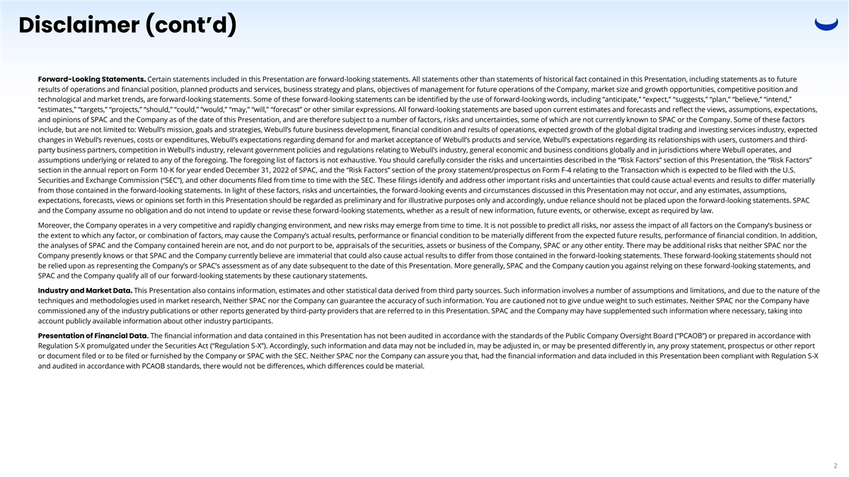 Disclaimer (cont’d) Forward-Looking Statements. Certain statements included in this Presentation are forward-looking statements. All statements other than statements of historical fact contained in this Presentation, including statements as to future results of operations and financial position, planned products and services, business strategy and plans, objectives of management for future operations of the Company, market size and growth opportunities, competitive position and technological and market trends, are forward-looking statements. Some of these forward-looking statements can be identified by the use of forward-looking words, including “anticipate,” “expect,” “suggests,” “plan,” “believe,” “intend,” “estimates,” “targets,” “projects,” “should,” “could,” “would,” “may,” “will,” “forecast” or other similar expressions. All forward-looking statements are based upon current estimates and forecasts and reflect the views, assumptions, expectations, and opinions of SPAC and the Company as of the date of this Presentation, and are therefore subject to a number of factors, risks and uncertainties, some of which are not currently known to SPAC or the Company. Some of these factors include, but are not limited to: Webull’s mission, goals and strategies, Webull’s future business development, financial condition and results of operations, expected growth of the global digital trading and investing services industry, expected changes in Webull’s revenues, costs or expenditures, Webull’s expectations regarding demand for and market acceptance of Webull’s products and service, Webull’s expectations regarding its relationships with users, customers and third- party business partners, competition in Webull’s industry, relevant government policies and regulations relating to Webull’s industry, general economic and business conditions globally and in jurisdictions where Webull operates, and assumptions underlying or related to any of the foregoing. The foregoing list of factors is not exhaustive. You should carefully consider the risks and uncertainties described in the “Risk Factors” section of this Presentation, the “Risk Factors” section in the annual report on Form 10-K for year ended December 31, 2022 of SPAC, and the “Risk Factors” section of the proxy statement/prospectus on Form F-4 relating to the Transaction which is expected to be filed with the U.S. Securities and Exchange Commission (“SEC”), and other documents filed from time to time with the SEC. These filings identify and address other important risks and uncertainties that could cause actual events and results to differ materially from those contained in the forward-looking statements. In light of these factors, risks and uncertainties, the forward-looking events and circumstances discussed in this Presentation may not occur, and any estimates, assumptions, expectations, forecasts, views or opinions set forth in this Presentation should be regarded as preliminary and for illustrative purposes only and accordingly, undue reliance should not be placed upon the forward-looking statements. SPAC and the Company assume no obligation and do not intend to update or revise these forward-looking statements, whether as a result of new information, future events, or otherwise, except as required by law. Moreover, the Company operates in a very competitive and rapidly changing environment, and new risks may emerge from time to time. It is not possible to predict all risks, nor assess the impact of all factors on the Company’s business or the extent to which any factor, or combination of factors, may cause the Company’s actual results, performance or financial condition to be materially different from the expected future results, performance of financial condition. In addition, the analyses of SPAC and the Company contained herein are not, and do not purport to be, appraisals of the securities, assets or business of the Company, SPAC or any other entity. There may be additional risks that neither SPAC nor the Company presently knows or that SPAC and the Company currently believe are immaterial that could also cause actual results to differ from those contained in the forward-looking statements. These forward-looking statements should not be relied upon as representing the Company’s or SPAC’s assessment as of any date subsequent to the date of this Presentation. More generally, SPAC and the Company caution you against relying on these forward-looking statements, and SPAC and the Company qualify all of our forward-looking statements by these cautionary statements. Industry and Market Data. This Presentation also contains information, estimates and other statistical data derived from third party sources. Such information involves a number of assumptions and limitations, and due to the nature of the techniques and methodologies used in market research, Neither SPAC nor the Company can guarantee the accuracy of such information. You are cautioned not to give undue weight to such estimates. Neither SPAC nor the Company have commissioned any of the industry publications or other reports generated by third-party providers that are referred to in this Presentation. SPAC and the Company may have supplemented such information where necessary, taking into account publicly available information about other industry participants. Presentation of Financial Data. The financial information and data contained in this Presentation has not been audited in accordance with the standards of the Public Company Oversight Board (“PCAOB”) or prepared in accordance with Regulation S-X promulgated under the Securities Act (“Regulation S-X”). Accordingly, such information and data may not be included in, may be adjusted in, or may be presented differently in, any proxy statement, prospectus or other report or document filed or to be filed or furnished by the Company