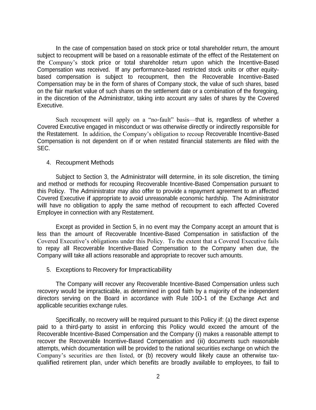 2 In the case of compensation based on stock price or total shareholder return, the amount subject to recoupment will be based on a reasonable estimate of the effect of the Restatement on the Company’s stock price or total shareholder return upon which the Incentive-Based Compensation was received. If any performance-based restricted stock units or other equity- based compensation is subject to recoupment, then the Recoverable Incentive-Based Compensation may be in the form of shares of Company stock, the value of such shares, based on the fair market value of such shares on the settlement date or a combination of the foregoing, in the discretion of the Administrator, taking into account any sales of shares by the Covered Executive. Such recoupment will apply on a “no-fault” basis—that is, regardless of whether a Covered Executive engaged in misconduct or was otherwise directly or indirectly responsible for the Restatement. In addition, the Company’s obligation to recoup Recoverable Incentive-Based Compensation is not dependent on if or when restated financial statements are filed with the SEC. 4. Recoupment Methods Subject to Section 3, the Administrator will determine, in its sole discretion, the timing and method or methods for recouping Recoverable Incentive-Based Compensation pursuant to this Policy. The Administrator may also offer to provide a repayment agreement to an affected Covered Executive if appropriate to avoid unreasonable economic hardship. The Administrator will have no obligation to apply the same method of recoupment to each affected Covered Employee in connection with any Restatement. Except as provided in Section 5, in no event may the Company accept an amount that is less than the amount of Recoverable Incentive-Based Compensation in satisfaction of the Covered Executive’s obligations under this Policy. To the extent that a Covered Executive fails to repay all Recoverable Incentive-Based Compensation to the Company when due, the Company will take all actions reasonable and appropriate to recover such amounts. 5. Exceptions to Recovery for Impracticability The Company will recover any Recoverable Incentive-Based Compensation unless such recovery would be impracticable, as determined in good faith by a majority of the independent directors serving on the Board in accordance with Rule 10D-1 of the Exchange Act and applicable securities exchange rules. Specifically, no recovery will be required pursuant to this Policy if: (a) the direct expense paid to a third-party to assist in enforcing this Policy would exceed the amount of the Recoverable Incentive-Based Compensation and the Company (i) makes a reasonable attempt to recover the Recoverable Incentive-Based Compensation and (ii) documents such reasonable attempts, which documentation will be provided to the national securities exchange on which the Company’s securities are then listed, or (b) recovery would likely cause an otherwise tax- qualified retirement plan, under which benefits are broadly available to employees, to fail to