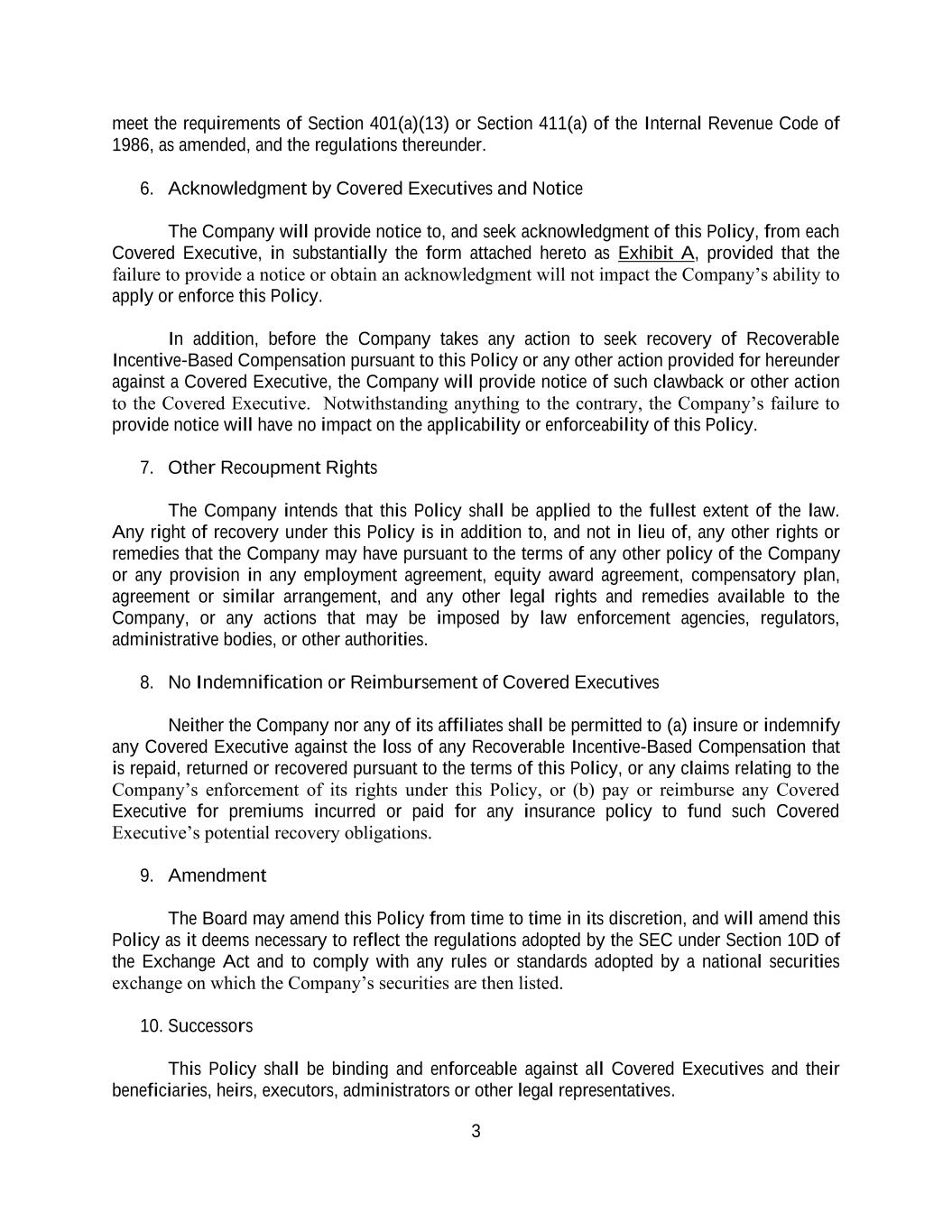 3 meet the requirements of Section 401(a)(13) or Section 411(a) of the Internal Revenue Code of 1986, as amended, and the regulations thereunder. 6. Acknowledgment by Covered Executives and Notice The Company will provide notice to, and seek acknowledgment of this Policy, from each Covered Executive, in substantially the form attached hereto as Exhibit A, provided that the failure to provide a notice or obtain an acknowledgment will not impact the Company’s ability to apply or enforce this Policy. In addition, before the Company takes any action to seek recovery of Recoverable Incentive-Based Compensation pursuant to this Policy or any other action provided for hereunder against a Covered Executive, the Company will provide notice of such clawback or other action to the Covered Executive. Notwithstanding anything to the contrary, the Company’s failure to provide notice will have no impact on the applicability or enforceability of this Policy. 7. Other Recoupment Rights The Company intends that this Policy shall be applied to the fullest extent of the law. Any right of recovery under this Policy is in addition to, and not in lieu of, any other rights or remedies that the Company may have pursuant to the terms of any other policy of the Company or any provision in any employment agreement, equity award agreement, compensatory plan, agreement or similar arrangement, and any other legal rights and remedies available to the Company, or any actions that may be imposed by law enforcement agencies, regulators, administrative bodies, or other authorities. 8. No Indemnification or Reimbursement of Covered Executives Neither the Company nor any of its affiliates shall be permitted to (a) insure or indemnify any Covered Executive against the loss of any Recoverable Incentive-Based Compensation that is repaid, returned or recovered pursuant to the terms of this Policy, or any claims relating to the Company’s enforcement of its rights under this Policy, or (b) pay or reimburse any Covered Executive for premiums incurred or paid for any insurance policy to fund such Covered Executive’s potential recovery obligations. 9. Amendment The Board may amend this Policy from time to time in its discretion, and will amend this Policy as it deems necessary to reflect the regulations adopted by the SEC under Section 10D of the Exchange Act and to comply with any rules or standards adopted by a national securities exchange on which the Company’s securities are then listed. 10. Successors This Policy shall be binding and enforceable against all Covered Executives and their beneficiaries, heirs, executors, administrators or other legal representatives.