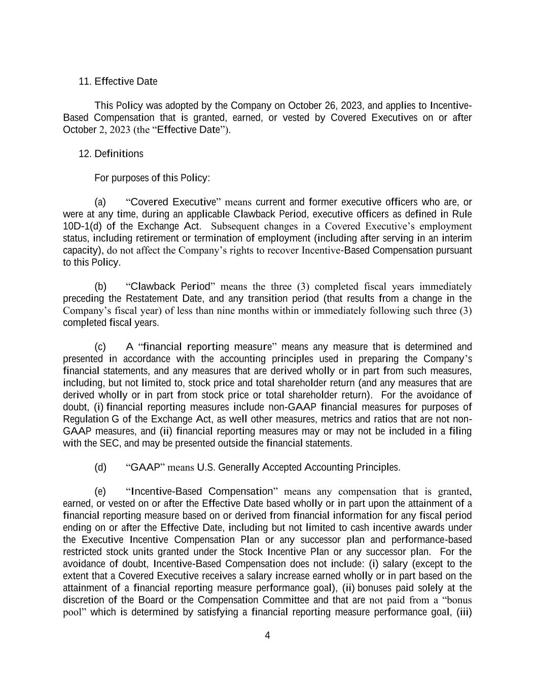 4 11. Effective Date This Policy was adopted by the Company on October 26, 2023, and applies to Incentive- Based Compensation that is granted, earned, or vested by Covered Executives on or after October 2, 2023 (the “Effective Date”). 12. Definitions For purposes of this Policy: (a) “Covered Executive” means current and former executive officers who are, or were at any time, during an applicable Clawback Period, executive officers as defined in Rule 10D-1(d) of the Exchange Act. Subsequent changes in a Covered Executive’s employment status, including retirement or termination of employment (including after serving in an interim capacity), do not affect the Company’s rights to recover Incentive-Based Compensation pursuant to this Policy. (b) “Clawback Period” means the three (3) completed fiscal years immediately preceding the Restatement Date, and any transition period (that results from a change in the Company’s fiscal year) of less than nine months within or immediately following such three (3) completed fiscal years. (c) A “financial reporting measure” means any measure that is determined and presented in accordance with the accounting principles used in preparing the Company’s financial statements, and any measures that are derived wholly or in part from such measures, including, but not limited to, stock price and total shareholder return (and any measures that are derived wholly or in part from stock price or total shareholder return). For the avoidance of doubt, (i) financial reporting measures include non-GAAP financial measures for purposes of Regulation G of the Exchange Act, as well other measures, metrics and ratios that are not non- GAAP measures, and (ii) financial reporting measures may or may not be included in a filing with the SEC, and may be presented outside the financial statements. (d) “GAAP” means U.S. Generally Accepted Accounting Principles. (e) “Incentive-Based Compensation” means any compensation that is granted, earned, or vested on or after the Effective Date based wholly or in part upon the attainment of a financial reporting measure based on or derived from financial information for any fiscal period ending on or after the Effective Date, including but not limited to cash incentive awards under the Executive Incentive Compensation Plan or any successor plan and performance-based restricted stock units granted under the Stock Incentive Plan or any successor plan. For the avoidance of doubt, Incentive-Based Compensation does not include: (i) salary (except to the extent that a Covered Executive receives a salary increase earned wholly or in part based on the attainment of a financial reporting measure performance goal), (ii) bonuses paid solely at the discretion of the Board or the Compensation Committee and that are not paid from a “bonus pool” which is determined by satisfying a financial reporting measure performance goal, (iii)