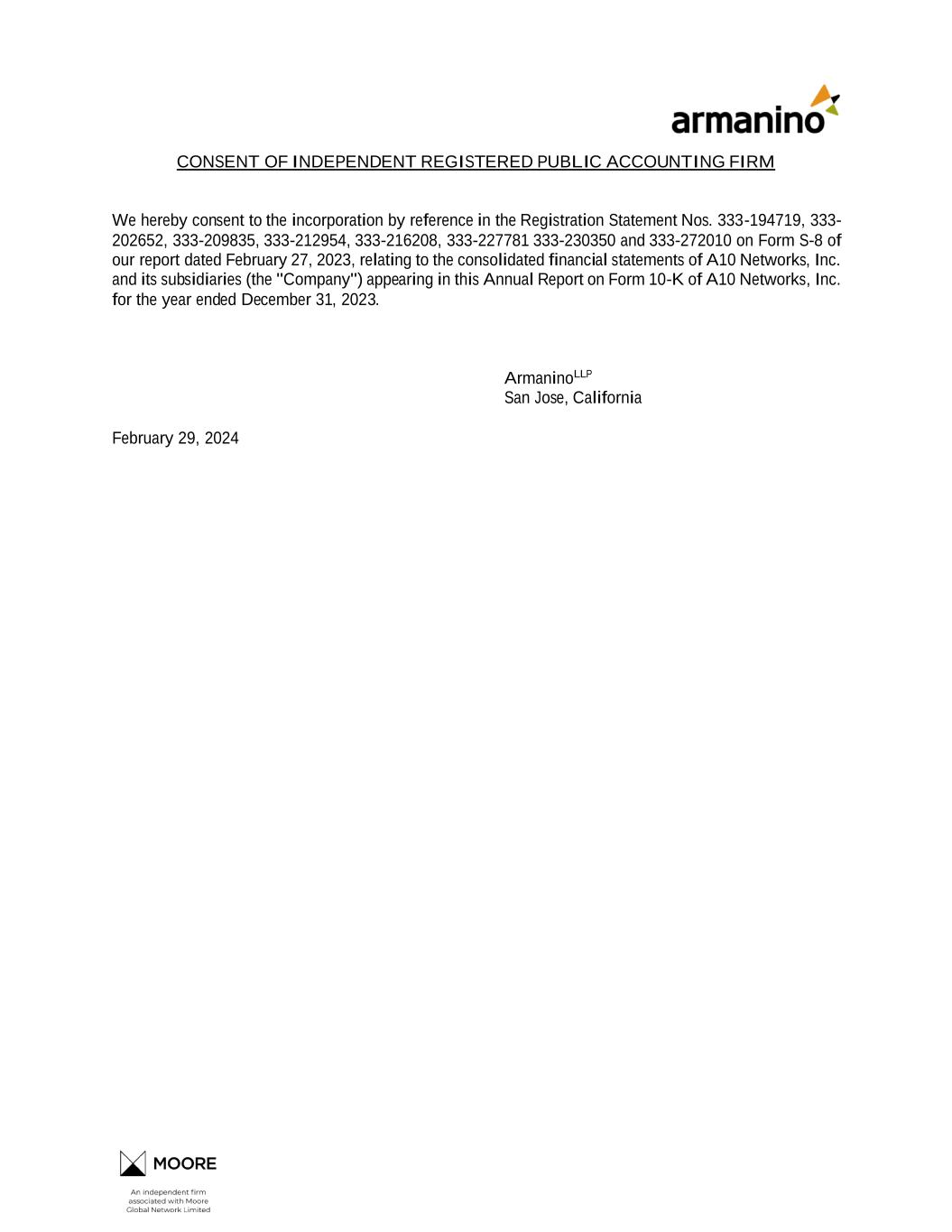 CONSENT OF INDEPENDENT REGISTERED PUBLIC ACCOUNTING FIRM We hereby consent to the incorporation by reference in the Registration Statement Nos. 333-194719, 333- 202652, 333-209835, 333-212954, 333-216208, 333-227781 333-230350 and 333-272010 on Form S-8 of our report dated February 27, 2023, relating to the consolidated financial statements of A10 Networks, Inc. and its subsidiaries (the "Company") appearing in this Annual Report on Form 10-K of A10 Networks, Inc. for the year ended December 31, 2023. ArmaninoLLP San Jose, California February 29, 2024
