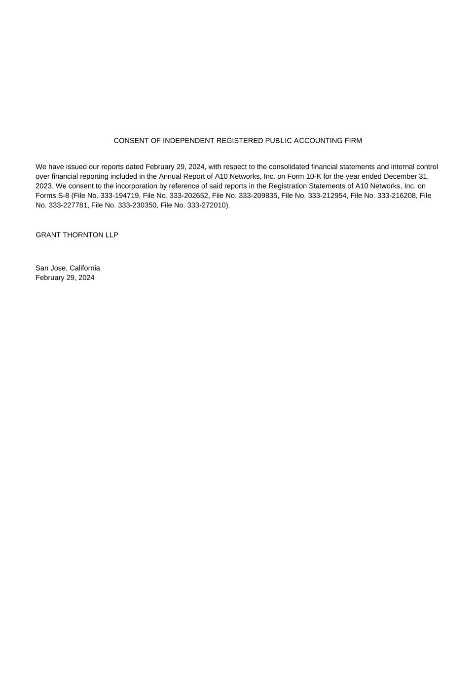 CONSENT OF INDEPENDENT REGISTERED PUBLIC ACCOUNTING FIRM We have issued our reports dated February 29, 2024, with respect to the consolidated financial statements and internal control over financial reporting included in the Annual Report of A10 Networks, Inc. on Form 10-K for the year ended December 31, 2023. We consent to the incorporation by reference of said reports in the Registration Statements of A10 Networks, Inc. on Forms S-8 (File No. 333-194719, File No. 333-202652, File No. 333-209835, File No. 333-212954, File No. 333-216208, File No. 333-227781, File No. 333-230350, File No. 333-272010). GRANT THORNTON LLP San Jose, California February 29, 2024