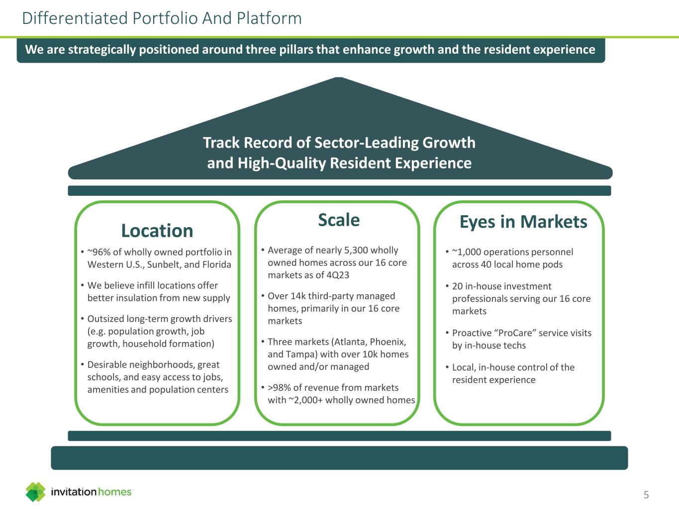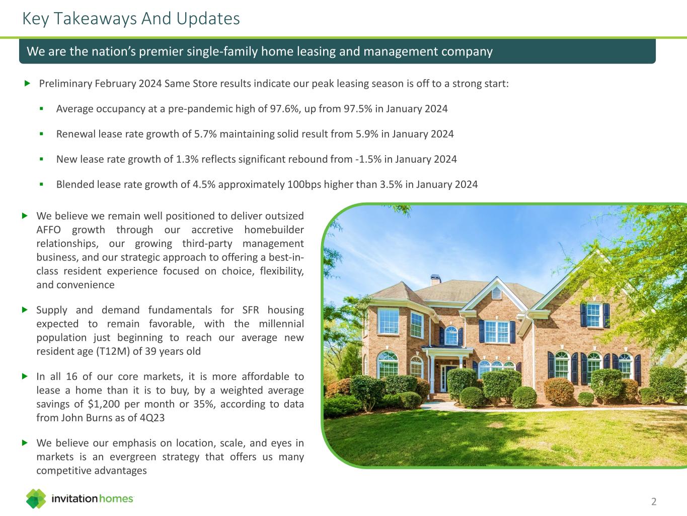 Key Takeaways And Updates We are the nation’s premier single-family home leasing and management company We believe we remain well positioned to deliver outsized AFFO growth through our accretive homebuilder relationships, our growing third-party management business, and our strategic approach to offering a best-in- class resident experience focused on choice, flexibility, and convenience Supply and demand fundamentals for SFR housing expected to remain favorable, with the millennial population just beginning to reach our average new resident age (T12M) of 39 years old In all 16 of our core markets, it is more affordable to lease a home than it is to buy, by a weighted average savings of $1,200 per month or 35%, according to data from John Burns as of 4Q23 We believe our emphasis on location, scale, and eyes in markets is an evergreen strategy that offers us many competitive advantages Preliminary February 2024 Same Store results indicate our peak leasing season is off to a strong start: Average occupancy at a pre-pandemic high of 97.6%, up from 97.5% in January 2024 Renewal lease rate growth of 5.7% maintaining solid result from 5.9% in January 2024 New lease rate growth of 1.3% reflects significant rebound from -1.5% in January 2024 Blended lease rate growth of 4.5% approximately 100bps higher than 3.5% in January 2024 2