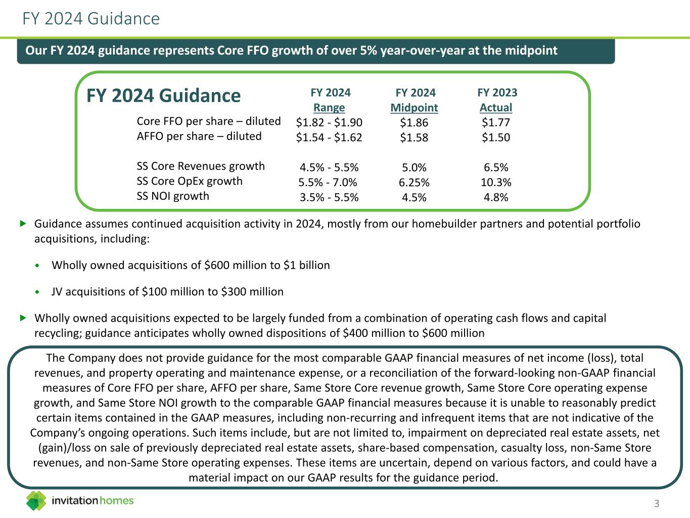 The Company does not provide guidance for the most comparable GAAP financial measures of net income (loss), total revenues, and property operating and maintenance expense, or a reconciliation of the forward-looking non-GAAP financial measures of Core FFO per share, AFFO per share, Same Store Core revenue growth, Same Store Core operating expense growth, and Same Store NOI growth to the comparable GAAP financial measures because it is unable to reasonably predict certain items contained in the GAAP measures, including non-recurring and infrequent items that are not indicative of the Company’s ongoing operations. Such items include, but are not limited to, impairment on depreciated real estate assets, net (gain)/loss on sale of previously depreciated real estate assets, share-based compensation, casualty loss, non-Same Store revenues, and non-Same Store operating expenses. These items are uncertain, depend on various factors, and could have a material impact on our GAAP results for the guidance period. FY 2024 Guidance Our FY 2024 guidance represents Core FFO growth of over 5% year-over-year at the midpoint Track Record of Sector-Leading Growth and High-Quality Resident Experience FY 2024 Guidance FY 2024 Range $1.82 - $1.90 $1.54 - $1.62 4.5% - 5.5% 5.5% - 7.0% 3.5% - 5.5% Core FFO per share – diluted AFFO per share – diluted SS Core Revenues growth SS Core OpEx growth SS NOI growth FY 2023 Actual $1.77 $1.50 6.5% 10.3% 4.8% FY 2024 Midpoint $1.86 $1.58 5.0% 6.25% 4.5% Guidance assumes continued acquisition activity in 2024, mostly from our homebuilder partners and potential portfolio acquisitions, including: • Wholly owned acquisitions of $600 million to $1 billion • JV acquisitions of $100 million to $300 million Wholly owned acquisitions expected to be largely funded from a combination of operating cash flows and capital recycling; guidance anticipates wholly owned dispositions of $400 million to $600 million 3