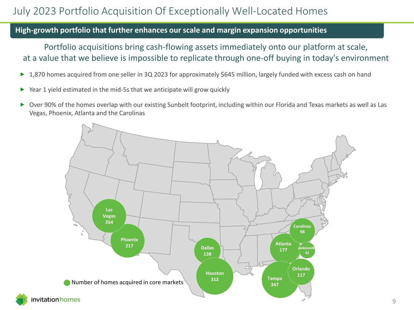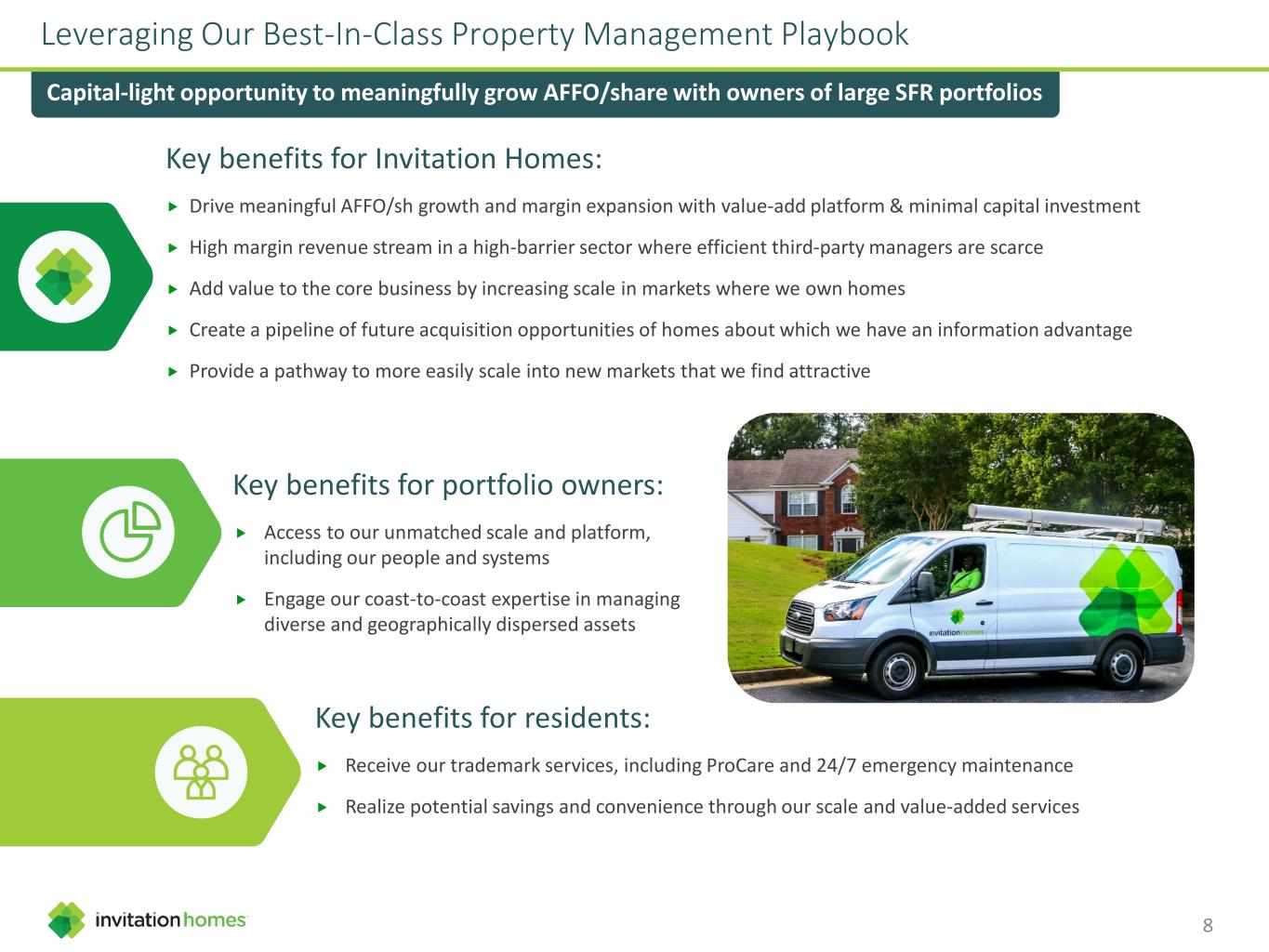 Key benefits for Invitation Homes: Drive meaningful AFFO/sh growth and margin expansion with value-add platform & minimal capital investment High margin revenue stream in a high-barrier sector where efficient third-party managers are scarce Add value to the core business by increasing scale in markets where we own homes Create a pipeline of future acquisition opportunities of homes about which we have an information advantage Provide a pathway to more easily scale into new markets that we find attractive Leveraging Our Best-In-Class Property Management Playbook Capital-light opportunity to meaningfully grow AFFO/share with owners of large SFR portfolios Key benefits for portfolio owners: Access to our unmatched scale and platform, including our people and systems Engage our coast-to-coast expertise in managing diverse and geographically dispersed assets Key benefits for residents: Receive our trademark services, including ProCare and 24/7 emergency maintenance Realize potential savings and convenience through our scale and value-added services 8