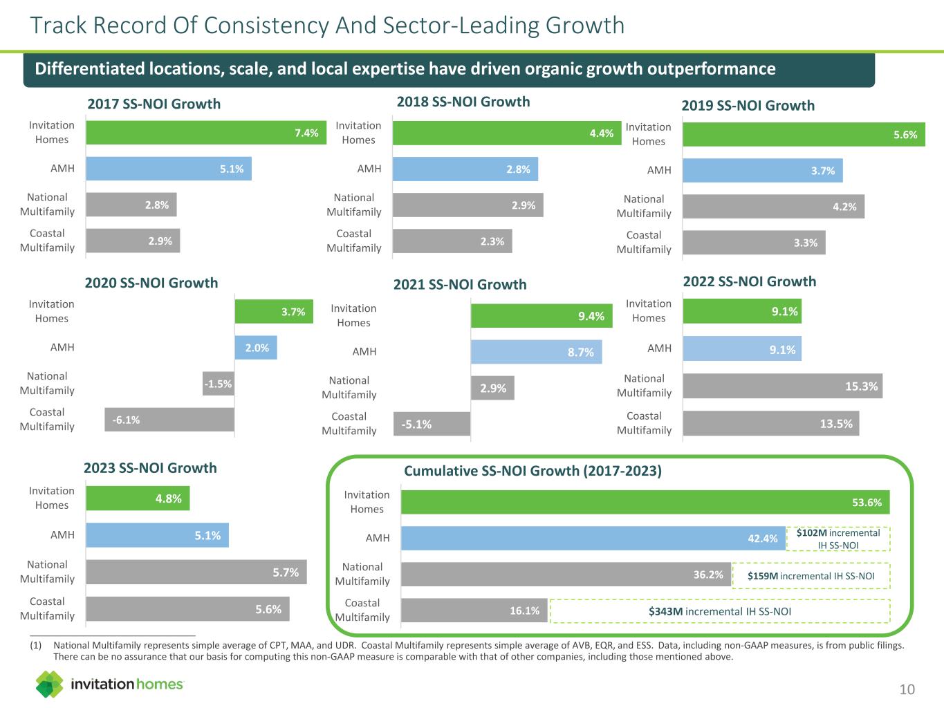 53.6% 42.4% 36.2% 16.1% Invitation Homes AMH National Multifamily Coastal Multifamily Cumulative SS-NOI Growth (2017-2023) Track Record Of Consistency And Sector-Leading Growth 7.4% 5.1% 2.8% 2.9% Invitation Homes AMH National Multifamily Coastal Multifamily 2017 SS-NOI Growth 4.4% 2.8% 2.9% 2.3% Invitation Homes AMH National Multifamily Coastal Multifamily 2018 SS-NOI Growth 5.6% 3.7% 4.2% 3.3% Invitation Homes AMH National Multifamily Coastal Multifamily 2019 SS-NOI Growth 3.7% 2.0% -1.5% -6.1% Invitation Homes AMH National Multifamily Coastal Multifamily 2020 SS-NOI Growth 9.4% 8.7% 2.9% -5.1% Invitation Homes AMH National Multifamily Coastal Multifamily 2021 SS-NOI Growth 9.1% 9.1% 15.3% 13.5% Invitation Homes AMH National Multifamily Coastal Multifamily 2022 SS-NOI Growth $102M incremental IH SS-NOI $159M incremental IH SS-NOI $343M incremental IH SS-NOI Differentiated locations, scale, and local expertise have driven organic growth outperformance ________________________________________________ (1) National Multifamily represents simple average of CPT, MAA, and UDR. Coastal Multifamily represents simple average of AVB, EQR, and ESS. Data, including non-GAAP measures, is from public filings. There can be no assurance that our basis for computing this non-GAAP measure is comparable with that of other companies, including those mentioned above. 4.8% 5.1% 5.7% 5.6% Invitation Homes AMH National Multifamily Coastal Multifamily 2023 SS-NOI Growth 10