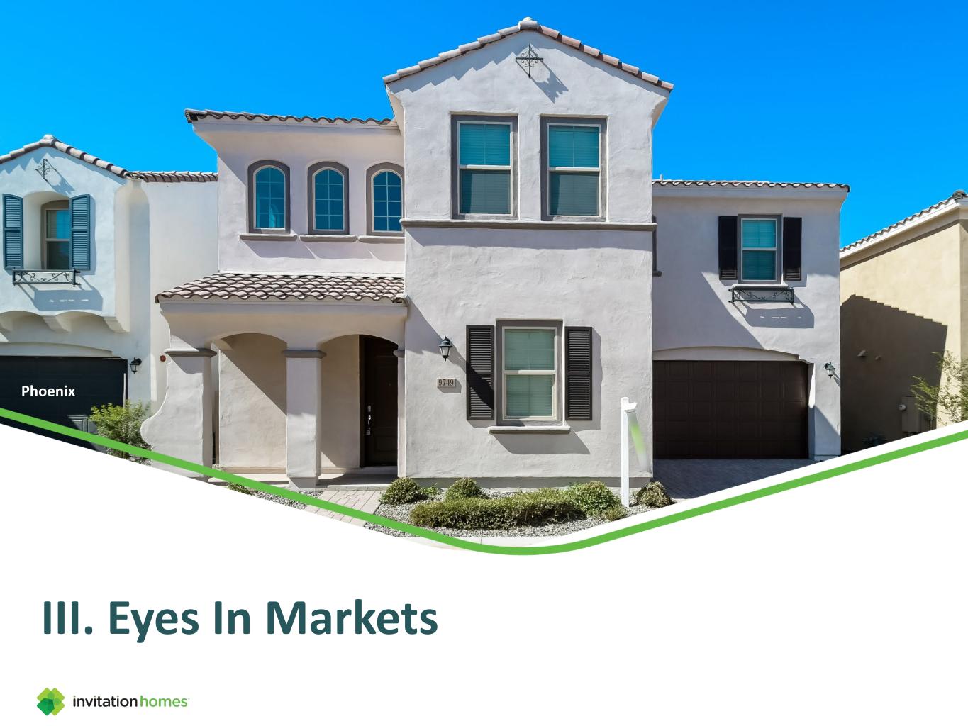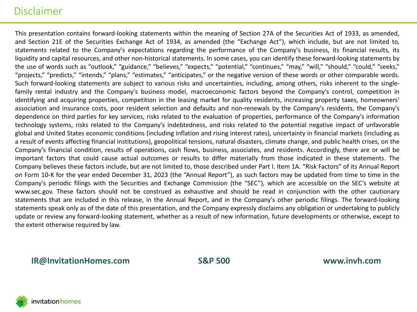 Disclaimer IR@InvitationHomes.com S&P 500 www.invh.com This presentation contains forward-looking statements within the meaning of Section 27A of the Securities Act of 1933, as amended, and Section 21E of the Securities Exchange Act of 1934, as amended (the “Exchange Act”), which include, but are not limited to, statements related to the Company's expectations regarding the performance of the Company's business, its financial results, its liquidity and capital resources, and other non-historical statements. In some cases, you can identify these forward-looking statements by the use of words such as “outlook,” “guidance,” “believes,” “expects,” “potential,” “continues,” “may,” “will,” “should,” “could,” “seeks,” “projects,” “predicts,” “intends,” “plans,” “estimates,” “anticipates,” or the negative version of these words or other comparable words. Such forward-looking statements are subject to various risks and uncertainties, including, among others, risks inherent to the single- family rental industry and the Company's business model, macroeconomic factors beyond the Company's control, competition in identifying and acquiring properties, competition in the leasing market for quality residents, increasing property taxes, homeowners’ association and insurance costs, poor resident selection and defaults and non-renewals by the Company's residents, the Company's dependence on third parties for key services, risks related to the evaluation of properties, performance of the Company's information technology systems, risks related to the Company's indebtedness, and risks related to the potential negative impact of unfavorable global and United States economic conditions (including inflation and rising interest rates), uncertainty in financial markets (including as a result of events affecting financial institutions), geopolitical tensions, natural disasters, climate change, and public health crises, on the Company’s financial condition, results of operations, cash flows, business, associates, and residents. Accordingly, there are or will be important factors that could cause actual outcomes or results to differ materially from those indicated in these statements. The Company believes these factors include, but are not limited to, those described under Part I. Item 1A. “Risk Factors” of its Annual Report on Form 10-K for the year ended December 31, 2023 (the “Annual Report”), as such factors may be updated from time to time in the Company's periodic filings with the Securities and Exchange Commission (the “SEC”), which are accessible on the SEC’s website at www.sec.gov. These factors should not be construed as exhaustive and should be read in conjunction with the other cautionary statements that are included in this release, in the Annual Report, and in the Company's other periodic filings. The forward-looking statements speak only as of the date of this presentation, and the Company expressly disclaims any obligation or undertaking to publicly update or review any forward-looking statement, whether as a result of new information, future developments or otherwise, except to the extent otherwise required by law.