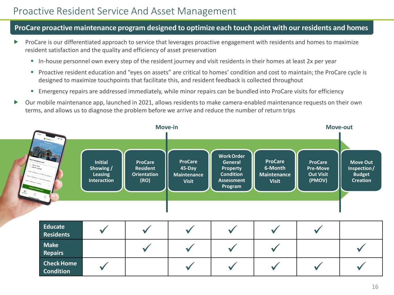 Best-In-Class, Local Approach To Operations And Investing Local, high-touch service with eyes in markets enhances control over asset quality and the resident experience Differentiated Approach Local resident service, leasing, and investment/asset management, with centralized oversight and tools Proactive resident care and asset preservation Collaboration between operations, investment, and asset mgmt teams to identify opportunities and drive consistency In-house accountability for every step of the resident journey and life of the home Home-by-home asset management decision making Scale in markets to enhance efficiency and intel________________________________________________ (1) Home and team counts as of January 31, 2024. WHOLLY- OWNED 84,523 Homes 20 Field investment personnel ~1,000 Field ops personnel covering 40 home pods Centralized strategy, tools, and oversight for a total of 102,658 homes(1) Collaboration JV- OWNED 3,840 Homes 3RD PARTY MANAGED 14,295 Homes 15